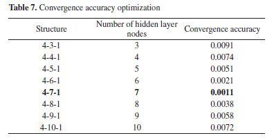 Neural network structure determination According to the number of control factors in Table 4, four independent variables including spout distance, duct diameter, duct distance and spread angle are determined. The dependent variable is the pump efficiency under different combinations of structural parameters, and then the number of input layers and output layers of the neural network is determined to be 4 and 1, respectively. For the hidden layer, it is necessary to analyze and judge according to the convergence accuracy, and use the BP neural network to pre-train the data in Table 6 to obtain the convergence accuracy of different hidden layers, as shown in Table 7.