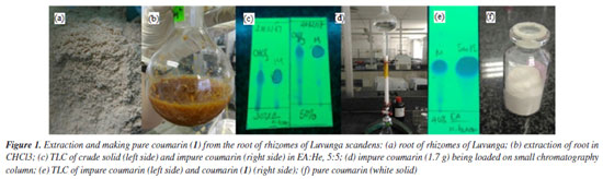 EXPERIMENTAL Materials The root rhizomes of Luvunga scandens are harvested in Ninh Hoa ward, Khanh Hoa province, Vietnam in 2023. The chemical reagents such as 7-(diethylamino)-4-methyl coumarin and NBS are supplied from Merck, Germany and Sigma-Aldrich, South Korea, respectively. TLC (thin-layer chromatography), normal phase (230-400 mesh and silica gel for the chromatography column (89943-1KG-F) are bought from Sigma-Aldrich company (South Korea). The analytical TLC was done on silica gel plates (Kieselgel 60 F254, Merck), Singapore. The HR-ESI-MS mass spectra was carried out using a Bruker MicroTOF-QII spectrometer (Germany). The Bruker AM500 FT-NMR was used to record 1H and 13C NMR (nuclear magnetic resonance) spectra, as well as DEPT (distortionless enhancement by polarization transfer), HSQC (heteronuclear single quantum correlation), and HMBC (heteronuclear multiple bond correlation). The FTIR (Fourier transform infrared) spectra were measured with Bruker-German equipment. The software used were AutoDockTools version 1.5.6rc3 (1999-2011),37-42 Discovery Studio Visualizer v21.1.0.20298, copyright 2020,45,46 Molegro Molecular Viewer (MMW), 2012.2.5.0-2012-10-10,47 Desmond in Linux operating system, version 2.0-2018,54 and ChemDraw 12.0.2.1076.61 Methods Extraction and isolation A 1.92 kg of root powder sample had been extracted by Soxhlet method using chloroform solvent, then filtered and dried with Na2SO4. The liquid part had evaporated under vacuum to yield the crude solid of 48 g (2.5%/root). Then, 2.5 g of crude solid have been loaded into the traditional chromatography column with silica gel being stationary phase and mobile phase that is ethyl acetate (EA):n-hexane (He) (2:8) and yield 1.7 g (68%/crude solid) of pure coumarin derivative (1) (Figure 1).