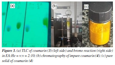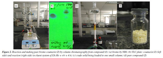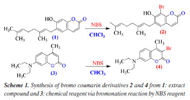 Synthesis compounds One gram of pure coumarin (1) in 10 mL of CHCl3 solvent have been poured into one small 3 neck glass round bottom of 25 mL volumetric then it was added 0.597 g of NBS. Reaction was kept at RT (room temperature) in about 1 h and monitored by TLC with eluent system (EA:He, 4:6). After completing reaction, liquid part has been concentrated in rotary vacuum evaporator until forming crude solid. The crude bromo coumarin is yielded 0.531 g (41.9%). Crude solid has been separated by column chromatography with starting eluent system of EA:He, 9:1, until collecting pure bromo coumarin (2) (Figure 2). Compound 4: 10 g (0.04 mol) of 7-(diethylamino)-4-methyl coumarin (3) has been dissolved in 30 mL of CHCl3 using a magnetic stirrer, then it was added 7.72 g (0.04 mol) NBS in 25 mL CHCl3, and kept reactions at RT by stirring. The reaction was monitored by TLC every 30 min. After completing reaction, 1.5 h, liquid part has been collected in rotary vacuum evaporator until forming crude solid. The solid has been continuously to separate by column chromatography with eluent solvent of EA:He (2:10) (Figure 3 and Scheme 1).
