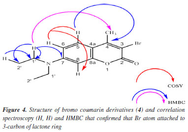 RESULTS AND DISCUSSIONS Compound 1: after extraction and isolation, coumarin is ostruthin (1). The bromination of ostruthin with NBS formed the bromo ostruthin (2) compound in yield of 41.9%. The physical chemistry of 1 was published in our previous article62 and indicated in Table S1 (Supplementary Material); compound 2: (E)-8-bromo-6-(3,7-dimethylocta-2,6-dien-1-yl)-7-hydroxy-2H-chromen-2-one (2): light yellow powder; IR (λmax, cm-1, KBr): 3337 (stretching vibration of OH, phenol), 1722 (stretching vibration of double bond of C=O), 1610 (stretching vibration of C=C double bond, alkene), 579 (stretching vibration of C-Br); 1H, 13C, HSQC, and HMBC, HRMS and FTIR have been indicated in Supplementary Material from Figures 3S to 5S, 7S and 9S: 1H NMR (500 MHz, D6, acetone): d (ppm) 8.89 (s, 1H, OH phenolic), 7.85 (d, J 9.5 Hz, 1H, H-4), 7.38 (s, 1H, H-5), 6.23 (d, J 9.5 Hz, 1H, H-3), 5.36 (t, J 6.8 Hz, 1H, H-12), 5.10 (t, J 7.5 Hz, 1H, H-16), 3.42 (d, J 7.0 Hz, 2H, CH2, H-11), 2.13-2.09 (m, 2H, H-14), 2.06-2.03 (m, 2H, H-15), 1.71 (s, 3H, H-19), 1.63 (s, 3H, H-18), 1.57 (s, 3H, H-20); 13C NMR (125 MHz, D6, acetone): d (ppm) 160.5 (C=O, C-2), 113.6 (C-3), 144.7 (C-4); 128.1 (C-5), 127.4 (C-6), 156.1 (C- 7), 98.5 (C-8), 151.5 (C-9), 113.7 (C-10), 29.1 (C-11), 122.0 (C-12), 137.9 (C-13), 40.4 (C-14), 27.2 (C-15), 125.0 (C-16), 131.8 (C-17), 25.8 (C-18), 16.2 (C-19), 17.7 (C-20); HRMS: theory calculation: [M + H]+ = 377.0752, experiment value: [M + H]+ = 377.0758. All experimental data have proved that it was exactly structure 2. Compound 4: 3-bromo-7-(diethylamino)-4-methyl-2H-chrome-2-one: yellow powder; as indicated in Figures 10S to 15S. The IR, 1H, 13C, DEPT, COSY (H,H), HSQC, HMBC, and HRMS confirmed the structure of bromo coumarin (4) and proved that bromo atom is attached to C-3 carbon of lactone ring of 4 via nucleophilic reaction of nucleophile bromo atom as followed data spectroscopy: IR (νmax, cm-1) 2957 (CH3), 1716, 1621, 1577, 1517 (stretching vibration of C=C double bond), 1410, 1348, 1267, 1213, 1075 (stretching vibration of C-O/C-N single bond), 830, 805 (stretching vibration of aromatic ring bearing substitution group), 744 (stretching vibration of C-Br single bond); 1H NMR (500 MHz, chloroform, D1, TMS): d (ppm) 1.20 (t, J 7.3 Hz, 6H, 2CH2-CH3), 2.51 (s, CH3), 3.40 (q, 4H, J 7.2 Hz, 2CH2-CH3), 6.47 (d, J 2.0 Hz, H8-Ar), 6.60 (dd, J1 9.3, J2 2.3 Hz, H6-Ar), 7.40 (d, J 9.0 Hz, H5-Ar). As shown in Figure 4, the COSY (H,H)-red lines demonstrates that H-5 proton couples with proton H-6 then coupling with H-8 proton, confirming interactions on 1H NMR and protons matching signals that are consistent with the structure of compound 4; 13C NMR (125 MHz, chloroform-d1, TMS), DEPT, and HSQC: d (ppm) 12.4 (CH3, CH3-CH2-N), 19.1 (CH3, CH3-alkenyl), 44.9 (CH2), 97.4 (CH), 105.7 (C-Br), 109.13 (CH), 109.06 (C=C), 126.1 (CH), 150.6 (C-N), 151.5 (C-CH3), 154.5 (C=C), 158.1 (C=O). As shown in Figure 4, Figures 13S and 14S exposed H, C correlation via HMBC (blue and pink colors) of compound 4: H-5 proton is correlated to C-4 and H-1' proton to C-7 and C-2'; HRMS: experimental value of [M + H]+ = 310.0343 and theoretical value of [M + H]+ = 310.0443, respectively, as shown in Figure 15S. All spectroscopy data such as IR, 1H, 13C, DEPT, COSY, HMBC, and HMBC proved that bromo atom is bonded to C-3 as seen in Figure 4.