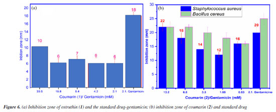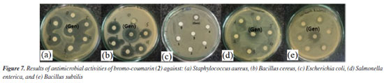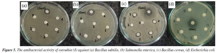 Antimicrobial activity Compound 1, also known as ostruthin, was tested for antimicrobial activity against Bacillus subtilis, Salmonella enterica, Bacillus cereus, and Escherichia coli, as depicted in Figures 5a-5d. Ostruthin (1) does not exhibit any antibacterial activity based on the results. Gentamicin exhibited significant activity at a concentration of 2.1 µM, resulting in an inhibition zone diameter of 18 mm, as illustrated in Figure 6a. The diameter of the inhibition zone of ostruthin (1) was measured at concentrations of 33.5, 18.8, 8.4, 4.2, and 2.1 mm, resulting in values of 10, 6, 7, 6, and 6 mm, respectively. These values correspond to the labels 0, 1, 2, 3, and 4, as depicted in Figure 6a. Figure 7 displays the bromination of ostruthin (1) to yield bromo ostruthin (2), as seen in Scheme 1. Compound 2 was tested for antimicrobial activity against Staphylococcus aureus, Bacillus cereus, Escherichia coli, Salmonella enterica, and Bacillus subtilis. Compound 2 demonstrated the excellent inhibition against Staphylococcus aureus (SA) and Bacillus cereus (BC) but only moderate inhibition against Salmonella enterica. It did not show any inhibition against Escherichia coli and Bacillus subtilis. Compound 2 displayed strong antimicrobial activity against both SA and BC bacteria, with larger inhibition zones observed for BC bacteria compared to SA, as shown in Figure 6b. The compound effectively inhibited BC bacteria at a concentration of 6.6 mM and SA bacteria at a concentration of 13.2 mM.