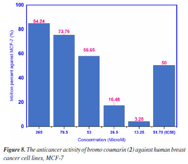 Anticancer activity The cytotoxicity of compound 2 against human breast cancer cell line had performed by MTT method as shown in Figure 8. As seen in Figure 8, compound 2 had demonstrated the potential ability of cytotoxicity against human breast cancer cell line (MCF-7) by the value of half-maximal inhibitory concentration (IC50) has been calculated 51.70 mM that had compared to drug camptothecin with value of 3.28 µM.