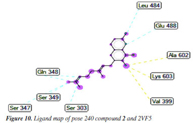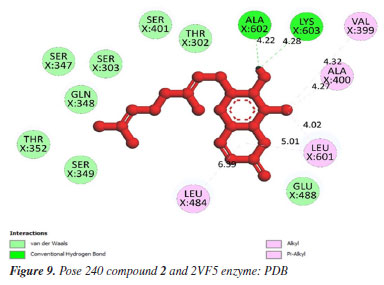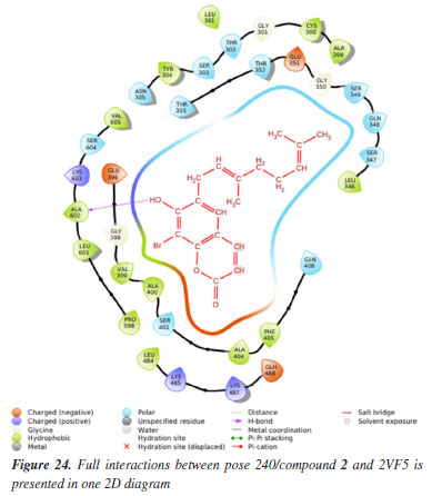 In silico docking and MD simulations Docking study Anti-bacteria against 2VF5 enzyme: PDB Compounds 2 and 4 exhibited a strong interaction with the 2VF5: PDB enzyme, leading to potent effects against SA and BC in vitro. The utilization of this enzyme is elucidated according to the general mechanism outlined by Mai et al.45 and Ece.53 Pose 240 (compound 2): pose 240 is the best docking pose among 500 docking conformations. It was docked to the active center of the 2VF5 enzyme, resulting in a free Gibbs energy value of -7.42 kcal mol-1 and an inhibition constant of 3.62 µM, as shown in Table 1. The value of estimated free energy of binding (ΔGº) is calculated based on AutoDock software:37-42 final intermolecular energy (1), final total internal energy (2), torsional free energy (3), and unbound system's energy (4), ΔGº (kcal mol-1) = (1) + (2) + (3) - (4). The inhibition constant is calculated based on the formula, . The number of hydrogen bondings are determined based on the signification interaction model by Discovery Studio visualizer software.45,46 Pose 240 exhibited a hydrogen bond between the hydrogen atom of hydroxyl phenolic and the oxygen atom on Ala 602 on 2VF5, as indicated in Table 1. The hydrogen bond is strong due to its short bond length. Figure 9 illustrates the significant ligand interaction model on a 2D diagram, showing that pose 240 has strong interactions with 2VF5 enzymes as three parts of this pose interact effectively.45 Pose 240's functional group forms two hydrogen bonds with the hydrogen atom of hydroxyl phenolic to Ala 602 and Lys 603 in the X chain. The capping group of pose 240 is determined by alkyl or pi-alkyl interactions from Leu 484 and Leu 601 to the lactone ring. The linkage of this pose is identified through alkyl or pi-alkyl interactions between Ala 400 and Leu 601 with the bromine atom of the pose. Figure 10 illustrates a ligand map displaying secondary interactions like hydrogen bonding, steric, and overlap interactions. Three hydrogen bonds are formed by Ala 602, Lys 603, and Val 399 with the hydrogen atom of hydroxyl phenolic. The residual amino acids involved in steric interactions in enzymes are Ser 303, Ser 347, Ser 349, Gln 348, Leu 484, and Glu 488. Steric interactions around pose indicate a strong interaction between pose 240 and the enzyme in overall conformational processing. Interactions that overlap are depicted as purple circles on 240 atoms. Increased diameter of the purple circle results in intensified overlapping interaction.