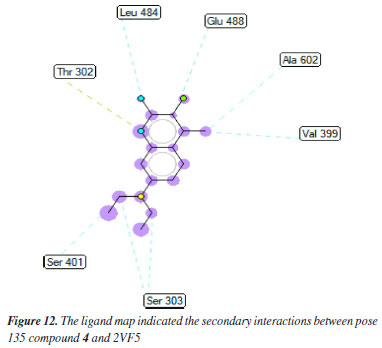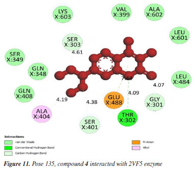 Pose 135 (compound 4): the best docking pose of compound 4 is docked to 2VF5 enzyme with the values of values of ΔGº and Ki of -6.30 and 23.97 µM, respectively. This pose involved one hydrogen bonding interaction between the oxygen atom of a lactone group and the N atom of Thr 302 amino acid, with a bond length of 2.89 Å, as illustrated in Table 1 and Figure 11. As seen in Figure 11, pose 135 interacted with 2VF5 via one hydrogen bond between the oxygen atom of the lactone group and Thr 302, which is the functional group of this pose. The capping group of this pose is identified through a pi-anion interaction or non-polar interaction between Glu 488 and the lactone ring, as well as a carbon-hydrogen interaction (nonpolar interaction) between Gly 301 and the oxygen atom of the C=O double bond. The pose linker is determined by an alkyl interaction between Ala 404 and the carbon atom of the methyl group in the ethyl chain. This demonstrated that pose 135 exhibited good interaction with enzymes. Figure 12 shows a ligand map revealing a secondary interaction between pose 135 and 2VF5. It highlights that pose 135 does not interact effectively with 2VF5 due to the limited secondary interactions in that area. Pose 240 exhibited a stronger interaction with 2VF5 compared to pose 135 in the ligand interaction model, as indicated by the free Gibbs energy values.