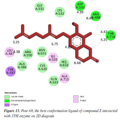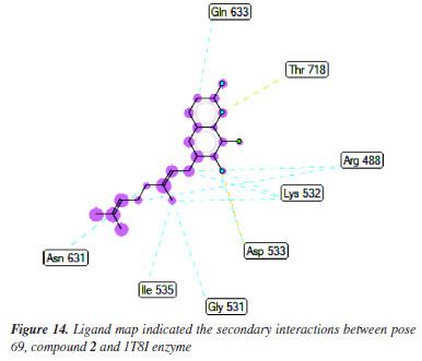 Anti-cancer against 1T8I enzyme: PDB in silico Pose 69 (compound 2): the 1T8I: PDB enzyme was chosen to demonstrate the potential inhibitory effects of the compound in vitro through a general mechanism.63 The optimal docking pose for compound 2, pose 69 that anchored to the active site of 1T8I:PDB with the values of ΔGº and Ki of -9.00 kcal mol-1 and 0.252 µM, respectively. Pose 69 formed three hydrogen bonds to the active center on 1T8I, as shown in Table 1. As seen in Figure 13, one ligand interaction model illustrated the significant interactions between pose 69 and residual amino acid on 1T8I enzyme. This pose exhibited full interactions through three components: hydrogen bonding from Asp 533, Arg 488, and Thr 718 to specific atoms in the ligand; capping group interactions with alkyl or pi-alkyl from Ile 535 and with Ala 715; and a linker part formed by pi-sigma interaction from Tyr 537 and Leu 487. Pose 69 demonstrated effective interaction with the enzyme-ligand interaction model. Figure 14 shows a ligand map displaying secondary interactions developing around this specific pose. The steric interactions occur around pose 69 is influenced by residual amino acids.