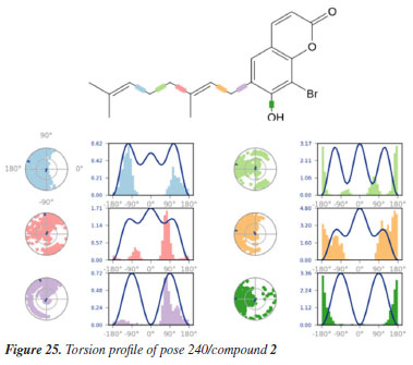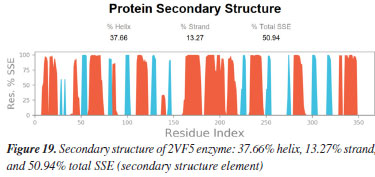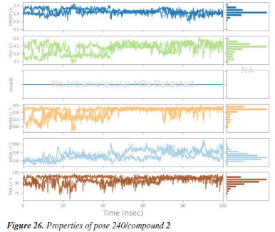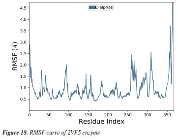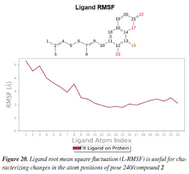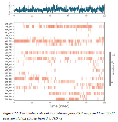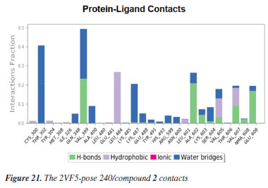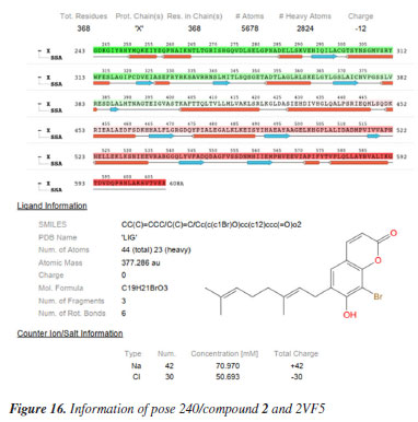 MD simulation A molecular dynamic simulation model was created to analyze the interaction between pose 240 (compound 2) and enzyme 2VF5 to explain why compound showed good activity against Staphylococcus aureus and Bacillus cereus in vitro. The significant simulation results of complex_pose 240_2VF5 are displayed in Figures 15 to 26 that control the stability of complex of pose 240 and 2VF5 throughout one simulation course from 0 to 100 ns. As seen in Figure 15, the conformation of pose 240 and the 2VF5 enzyme is illustrated and surrounded by water molecules. Figure 16 displays the details of enzyme 2VF5, pose 240, and the concentration of NaCl. The enzyme consists of 368 residues, 5678 atoms, 2824 heavy atoms, and a -12 charge. Pose 240, comprises of 44 atoms, 23 heavy atoms, 0 charge, and 6 rotational bonds. Sodium chloride is present at concentrations of 42 and 30 mM, respectively. The total charges of sodium (Na) and chlorine (Cl) ions are +42 and -30, respectively. Figure 17 displays the RMSD values of 2VF5 (left Y-axis) and pose 240 (right Y-axis) plotted against simulation times ranging from 0 to 100 nm during the simulation course. The number of simulation frames from 0 to 100 ns are 1000 frames. The frames of the 2VF5 enzyme were aligned to the reference frame backbone, and the RMSD value was calculated using the selected atoms. The RMSD values of the protein backbone in Figure 17 range from 1.2 to 2.8 Å, falling within the acceptable range of 1.0-3.0 Å. They discovered a counterpart within 40 to 80 ns of simulation time. The RMSD curve for the α-carbon of the 2VF5 enzyme fluctuates between 1.0 to 3.0 Å and stabilizes after 40 to 80 ns. The side chain conformation of 2VF5 has altered the root mean square deviation (RMSD) values from 2 to 3.2 Å. The simulation demonstrated convergence, with RMDS values stabilizing at a constant level. Pose 240 has been aligned with RMSD values ranging from 0.4 to 0.8 Å, showing minimal conformational changes throughout the simulation time (pink curve below). The RMSD values of pose 240 are calculated after aligning the 2VF5-pose 240 complex with the reference protein backbone. The large atoms in pose 240 are then analyzed using the red curve. The RMSD curve for pose 240 (dark red) is lower than that of the backbone (dark green) between 0 and 70 ns, indicating that pose 240 has remained close to its initial binding site and exhibited oscillations beyond 70 to 90 ns. The peaks on Figure 18 represent the regions of the 2VF5 that experienced the highest fluctuations during the simulation. The N- and C-terminal tails of the protein have exhibited the highest degree of fluctuation compared to other regions. Alpha helices and beta strands, which are secondary structure elements, tend to be more rigid than the unstructured regions of a protein and therefore exhibit less fluctuation compared to loop regions. As depicted in Figure 19, the enzyme's secondary structure consists of 37.66% helix, 13.27% strand, and 50.54% secondary structure elements (SSE). The plot has revealed the distribution of secondary structure elements (SSE) by residue index across the protein structure. Figure 20 illustrates how the ligand root mean square fluctuation (L-RMSF) can be utilized to explain variations in the positions of the ligand atoms. It was possible to explore the interaction of ligand fragments with the 2VF5 and their entropic role in the binding process by examining the ligand RMSF. The ‘fit ligand on protein' line for the 2VF5 enzyme shows the ligand fluctuations in the lower panel. The RMSF values in pose 240 have been altered from 2 to 5 Å. The contacts between the 2VF5 enzyme and Pose 240 are shown in Figure 21 within the time range of 0 to 100 ns. Enzyme interactions with pose 240 can be monitored during the simulation and classified into three types: hydrogen bonds, hydrophobic bonds, and water bridges. The stacked bar charts are standardized throughout the orbital period. The amino acid residue Val 399 in 2VF5 engages in hydrogen bonding with water bridges, persisting for 50% of the simulation duration. Hydrogen bonds have been established between Ala 602 and the water bridge, contributing to stability for 25% of the simulation duration. Residue 484 of leucine has established hydrophobic interactions that persist throughout less than 30% of the simulation duration. The hydrogen bonds, depicted in light green, are crucial in ligand binding. Hydrogen-bonding properties play a crucial role in drug design by significantly affecting drug specificity, metabolism, and absorption. Figure 22 displays the interactions and contacts, which are summarized in Figure 21. The total number of interactions that 2VF5 had with pose 240 throughout the orbital period is displayed at the top. The bottom displayed the residues that interacted with pose 240 in every trajectory frame. Several residues, including Thr 302, Val 399, Leu 484, Lys 487, and Ala 602, are associated with multiple interactions in pose 240. In Figure 23, pose 240's atom interactions with the amino acid residues of the 2VF5 enzyme occurred for over 30.0% of the simulation time in the selected trajectory. All atoms in pose 240 have engaged with water molecules, represented by the grey color. Figure 24 displays the complete interaction system between pose 240 and the 2VF5 enzyme in an aqueous environment. The pharmacokinetics display a single boundary delineating areas around position 240 as polar (light blue), positively charged (violet), hydrophobic (light green), and negatively charged. A hydrogen bond is created between Ala 602 and the hydrogen atom of hydroxyl phenolic on pose 240. It interacted with Ala 602 through a water bridge, maintaining stable interactions for approximately 30% of the simulation time, as shown in Figure 24. Additionally, it had multiple interactions with Ala 602, as depicted in Figure 21. The enzyme's residual amino acids involved in polar interactions are Ser 347, Gln 348, T
