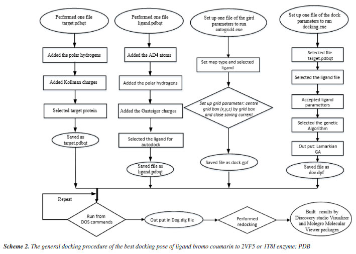 Antimicrobial activity assays in vitro The antibacterial activity of bromocoumarin derivatives was evaluated by disk diffusion method against Staphylococcus aureus (SA) and Bacillus cereus (BC) grown in an incubator at 37 ºC for 24 h. Medium containing solid Muller-Hinton agar (MHA) was prepared for bacterial development. Wells of 6 mm diameter were made in MHA gel disks. It was used a sterile cotton swab to spread each strain evenly onto each plate. The bromo coumarin derivatives have been prepared in concentrations of 5.0, 2.5, 1.25, 0.625, 0.3125 mg mL-1 and gentamicin at a concentration of 1 mg mL-1 for testing antimicrobial activity. Using a sterile micropipette, it was added 30 μL of test compound sample to each well. After 24 h of incubation at 25 ºC, it was used a meter ruler to measure the different levels of inhibition zones. Cytotoxicity Cytotoxicity of bromo coumarin was conducted based on MTT (methyl thiazolyl tetrazolium) assay and followed Shi et al.58 without minor change. The cytotoxicity of the tested compound 2 to MCF-7 cells was assayed using the MTT method. Briefly, MCF-7 cells were collected and seeded in 96-well plates at a density of 4.5 × 105 cells mL-1. After incubation in a humidified atmosphere of 5% CO2 at 37 ºC for 24 h, cells were exposed to fresh medium containing three concentrations (0.1, 1 and 10 µg mL-1) of tested compounds at 37 ºC and allowed to culture for another 24 h. An aliquot of 20 mL MTT tetrazolium salt dissolved in Hank's balanced salt solution at a final concentration of 5 mg mL-1 was added to each well and incubated in the CO2 incubator for 4 h. Finally, the medium was aspirated from each well and 150 mL DMSO (dimethyl sulfoxide) was added to dissolve the formazan crystals. The absorbance of each well was obtained using a Dynatech MR5000 plate counter at wavelength of 570 nm. The viability rate was calculated according to the following formula: viability rate = (OD570 sample/OD570 control) × 100%, where OD stands for optical density at 570 nm. In silico general docking procedure Following Scheme 1, we docked ligands or bromocoumarin derivatives to enzymes 2VF5: PDB and 1T8I, respectively, to understand bacterial inhibition and the reason for the ligand's high cytotoxicity in simulations. (X = 22.670, Y = 1.500, Z = 30.147) or (X = 26.577, Y = 22.697, Z = 8.113) are the active sites on 2VF5 and 1T8I, respectively. The grid parameters for the 1T8I and 2VF5 enzymes are set up in the grid file with 50 elements on the X, Y, and Z axes and 0.5 Å grid point spacing. There were 500 models that were installed.