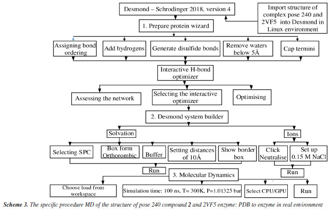 Molecular dynamic simulation The best stable complex between the best docking pose and enzyme 2VF5 in silico MD is implemented based on Scheme 3.