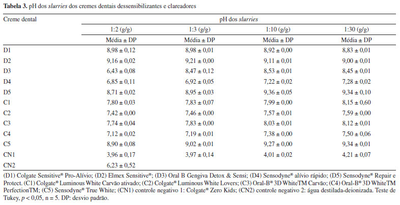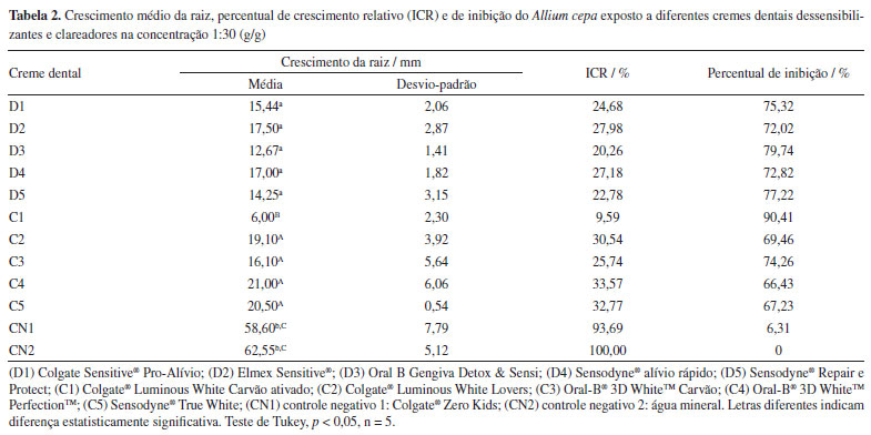 Teste de toxicidade em Artemia salina O teste de imobilidade/mortalidade em A. salina foi conduzido conforme descrito previamente19 com cistos de A. salina estocados a 4 °C. Um grama dos cistos foi dispensado em aquário (metade transparente e metade escuro) contendo solução de sal marinho (25 g L–1 de água destilada (NutriSelect® Basic, Merck KGaA, Brasil), sob iluminação artificial e aeração constante, temperatura de 28 °C durante 48 h de incubação para a eclosão dos cistos. Os náuplios foram distribuídos em tubos de ensaio (10 organismos para cada tubo) contendo 5 mL de slurries de creme dental em solução de sal marinho nas quatro concentrações previamente preparadas, e colocados em temperatura constante de 28 °C por 24 h. Após o período de exposição, os náuplios vivos foram contados, utilizando uma lupa. Náuplios foram considerados mortos quando não houve movimentação (mudança da posição do baricentro e apêndice) por 10 s de observação. O teste foi considerado válido diante da mortalidade de grupo controle negativo (apenas solução de sal marinho) inferior a 10%. Teste realizado em conjuntos de cinco repetições (n = 5) para cada concentração de creme dental. Teste de toxicidade em Allium cepa O teste de toxicidade aguda com bulbos de A. cepa foi conduzido conforme descrito previamente.16,18 Bulbos com diâmetro entre 15 e 20 mm livre de alterações na superfície foram tratados com remoção das cascas externas soltas e raspagem da base para expor as raízes, com cuidado para manter o anel radicular intacto. Para germinação prévia das raízes, os bulbos foram colocados em contato com água mineral em recipientes plásticos descartáveis, a temperatura ambiente constante (20 °C), protegidos contra a luz direta do sol, durante 24 h claro/escuro, total de 48 h. Para teste de inibição do crescimento radicular, cinco bulbos com brotamento (raízes com 1-2 cm) foram distribuídos aleatoriamente em cada recipiente contendo slurries dos onze cremes dentais na concentração de 1:30 (g/g) por período de 72 h. O controle negativo foi representado por cinco bulbos em água mineral. No final do tratamento, as duas raízes mais compridas de cada bulbo foram mensuradas com paquímetro, obtendo-se a média do comprimento. Com esse dado, o índice de crescimento relativo (ICR) e o percentual da inibição do crescimento foi calculado para cada uma das concentrações por comparação com a média do comprimento das raízes do controle negativo (água mineral) representativa de 100%. O teste foi conduzido em cinco replicatas. Determinação do pH O pH dos slurries de creme dental foi mensurado com pHmetro (modelo 91-02 Orion Research Corp. Cambridge, EUA) acoplado em um potenciômetro (modelo 290 A+, Orion Research Corp., Cambridge, EUA). Inicialmente, foi conduzida a calibração com soluções de pH 4 e pH 7. Cada slurry foi testado em triplicata e água destilada-deionizada foi usado como controle negativo. Análise estatística Os dados foram analisados estatisticamente usando pacote estatístico SPSS para Windows, versão 21.0 para Windows.20 O teste Shapiro-Wilk e teste Levene foram usados para determinar normalidade e homogeneidade das variâncias, respectivamente. Os dados demonstraram igualdade de variância e distribuição Gaussiana, nenhuma transformação de dados foi necessária. Teste ANOVA (análise de variância) e pós-teste de Tukey foram aplicados para média de organismos mortos/imóveis de A. salina, bem como para diferença entre médias do crescimento dos bulbos de A. cepa. As hipóteses foram testadas a nível de significância de 5%.