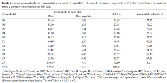 A mortalidade dos náuplios de A. salina expostos a todas as concentrações dos cremes dentais testes apresentaram valores superior às relatadas em estudos anteriores com gel de testosterona e estradiol23 e nanoplásticos.24 A Tabela 2 apresentou o crescimento médio da raiz, percentual de crescimento relativo e de inibição do A. cepa exposto aos cremes dentais dessensibilizantes e clareadores. A média ± desvio-padrão do crescimento radicular nos cremes dentais variou de 6,00 ± 2,30 a 20,50 ± 0,54 mm para C1 e C5, respectivamente. Constatou-se redução estatisticamente do comprimento das raízes dos bulbos expostos a todas as variantes de cremes dentais, quando comparados aos controles negativos (p < 0,05). O percentual de inibição foi superior a 50%. O creme dental controle (Colgate® Zero Kids) apresentou percentual de inibição do crescimento radicular de 6,31%.