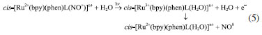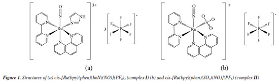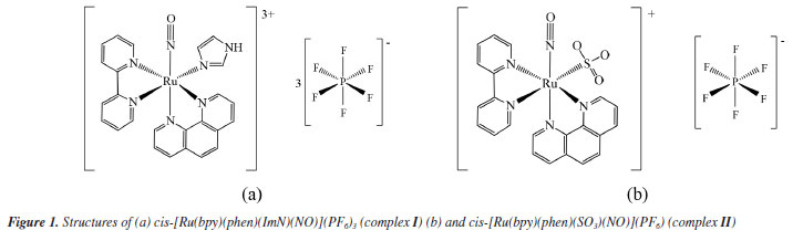 EXPERIMENTAL Chemicals Organic solvents from Sigma-Aldrich and Merck were used without any previous purification. RuCl3·xH2O, 2,2'-bipyridine (bpy), sodium nitrite (NaNO2), sodium sulfite (Na2SO3), 1,10'-phenanthroline (phen), imidazole (ImN) and trifluoroacetic acid (TFA) were purchased from Sigma-Aldrich and used without any further purification. cis-[Ru(bpy)(phen)Cl2] was prepared according to the procedure described in the literature.16 Nitrosyl complexes are soluble in acetone, methanol, dimethyl sulfoxide and partially soluble in water. Synthesis of the complexes cis-[Ru(bpy)(phen)(ImN)(NO2)](PF6) The cis-[Ru(bpy)(phen)Cl2] (0.100 g, 0.190 mmol) precursor complex was dissolved in a 1:1 ethanol/water solution (10 mL) and mixed with imidazole (0.013 g, 0.190 mmol) maintained under reflux for 2 h. After this time, NaNO2 (0.014 g, 0.190 mmol) was added, allowing to react for more than 2 h, under reflux. The solids (red crystalline solid) were precipitated by the addition of 1.0 g of ammonium hexafluorophosphate (NH4PF6). The solid was collected by filtration, washed with cold water, and dried under vacuum. Yield: 75% based on ruthenium(II) for the formula cis-[Ru(bpy)(phen)(ImN)(NO2)](PF6). Electronic spectrum in methanol: 222 nm (3.2 × 104 M-1 cm-1), 265 nm (3.3 × 104 M-1 cm-1), 288 nm (2.5 × 104 M-1 cm-1) 318 nm (5.4 × 103 M-1 cm-1), 450 nm (7.2 × 103 M-1 cm-1). Infrared data (KBr pellet, cm-1): ν(N-H) 3407, νsim (C-H) 3076 , ν(C=C) 1602, ν(C=N) 1466, 1445, νass (NO2-)1330, νsim (NO2-) 1284, δ(C-H) 724, 764. Electrochemical data: E1/2 = 0.79 V (versus Ag/AgCl) for the RuIII/II redox couple. cis-Na[Ru(bpy)(phen)(SO3)(NO2)] The cis-[Ru(bpy)(phen)Cl2] (0.100 g, 0.190 mmol) precursor complex was dissolved in a 1:1 ethanol/water solution (10 mL) and mixed with Na2SO3 (0.025 g, 0.190 mmol) and maintained under reflux for 2 h. After this time, NaNO2 (0.014 g, 0.190 mmol) was added, allowing to react for more than 2 h, under reflux. The solids (orange crystalline solid) were precipitated by the addition mixture of ethanol/ether solvents and dried under vacuum. Yield: 72% based on ruthenium(II) for the formula cis-Na[Ru(bpy)(phen)(SO3)(NO2)]. Electronic spectrum for cis-Na[Ru(bpy)(phen)SO3(NO2)] in methanol: 223 nm (2.1 × 104 M-1 cm-1), 265 nm (1.7 × 104 M-1 cm-1), 286 nm (1.2 × 104 M-1 cm-1) 315 nm (2.8 × 103 M-1 cm-1), 440 nm (3.4 × 103 M-1 cm-1). Infrared data (KBr pellet, cm-1): νsim (C-H) 3082, ν(C=C) 1602, ν(C=N) 1470, 1443, νass (NO2-)1325, νsim (NO2-) 1290, ν(SO32-) 1015, 958, 633, δ(C-H) 845, 722. Electrochemical data: E1/2 = 0.55 V (versus Ag/AgCl) for the RuIII/II redox couple. cis-[Ru(bpy)(phen)(ImN)(NO)](PF6)3 - complex I The complex I (Figure 1a) was prepared by dissolving the cis-[Ru(bpy)(phen)(ImN)(NO2)](PF6) complex (0.050 g, 0.072 mmol) in methanol (5 mL) under an argon atmosphere. To this mixture, 2.0 mL of concentrated trifluoroacetic acid was added to promote the conversion of NO2- to NO+.17 After 2 h, the mixture was concentrated in a rotary evaporator to ca. 8 mL, and the brown amorphous solid was precipitated by the addition of 1.0 g of ammonium hexafluorophosphate (NH4PF6), collected by filtration and stored under vacuum. The yield of the precipitated material was 60% based on ruthenium(II) for the formula cis-[Ru(bpy)(phen)(ImN)(NO)](PF6)3. Elemental analysis: C25H20F18N7OP3Ru: calcd.: C 30.92%, H 2.06%, N 10.10%; found: C 31.05%, H 2.04%, N 9.93%. Infrared data (KBr pellet, cm-1): ν(N-H) 3416, νsim (C-H) 3129, ν(NO+) 1942, ν(C=C) 1606, ν(C=N) 1453, 1436, δ(C-H) 769, 725, ν(PF6-) 839, 559.