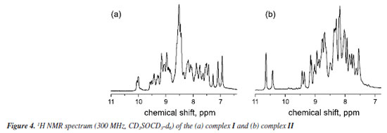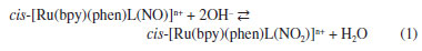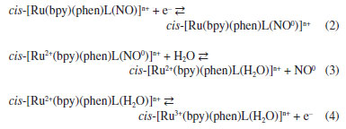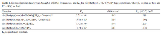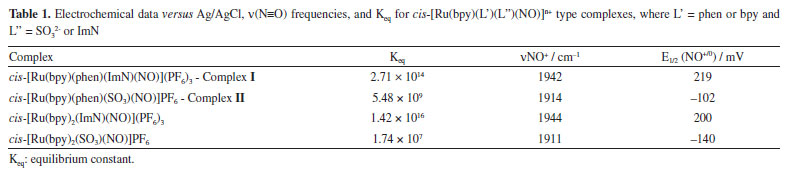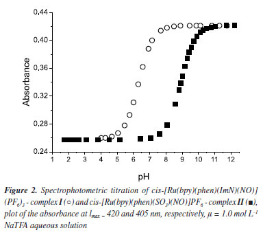 RESULTS AND DISCUSSION Complexes characterization The complexes I and II were synthesized from the equimolar ratio between the precursor compound cis-[Ru(bpy)(phen)Cl2] and the imidazole, sodium sulfite and sodium nitrite ligands to avoid the coordination of another molecule of these ligands to the metal center. Trifluoroacetic acid was used in excess, since this substance is intended to make the pH as low as possible to promote the conversion of NO2- to NO+. Ammonium hexafluorophosphate has the function of providing the PF6- ion necessary for the precipitation of these compounds. The cis-[Ru(bpy)(phen)L(NO+)]n+ complexes, where L = ImN (complex I) or SO32- (complex II), were prepared using an acid treatment of the cis-[Ru(bpy)(phen)L(NO2)]+/- aqueous solution. The acid-base equilibrium for the nitrosyl-nitro interconversion in the ruthenium(II) complexes (Equation 1) had been previously studied in similar systems.15,16 ![]() A reversible pH dependence (Equation 1) was observed, as indicated by the changes in UV-Vis spectroscopic results. These changes accompanying this acid-base reaction were collected for cis-[Ru(bpy)(phen)L(NO2)]+/- (Figures 1Sa and 1Sb, Supplementary Material, for L = ImN - complex I, SO32- - complex II, respectively), where it was observed the appearance of a new high-intensity band with a maximum at 420 nm (for complex I) and 405 nm (for complex II) at higher pH. The newly formed band is assigned to the dπ(RuII) → π*(bpy/phen) MLCT transition of the nitro species formed (Equation 1). Analogous spectroscopic behavior has been observed for other ruthenium nitrosyl complexes.15,26-29 The spectrophotometric titration curve for this equilibrium (Equation 1) showed only one inflexion, which can be indicative of a unique equilibrium as proposed, with a pH of half-interconversion at 6.3 (complex I) and 8.9 (complex II) (Figure 2). The measured equilibrium constant (Keq) values for a series of similar type compounds are shown in Table 1. Additionally, this Table includes other parameters such as E1/2 NO+/0 and νNO+.
