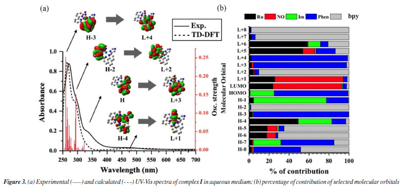 It is also worth mentioning that the acid-base equilibrium for the nitrosyl-nitro interconversion of the ruthenium(II) complexes has made them possible to be used as synthetic strategy systems.15,16 Here, the formation of complexes I and II as the product of the acid-base equilibrium described in Equation 1 was confirmed by analysis of the infrared spectrum (Figures 2S and 3S, Tables 1S and 2S, Supplementary Material). It was noticed that bands associated with the nitro ligand at 1330 and 1284 cm-1 disappeared, followed by the appearance of a new band related to the stretching mode of NO+ group at 1942 and 1914 cm-1 for complexes I and II, respectively.30 Furthermore, vibrational peaks corresponding to the bipyridine ligand from 1610 to 1400 cm-1 were observed for both complexes attributed to νC=C, νC=N.8,29,31-33 For complex II were observed peaks assigned to SO32- ligand at 521, 622, 990, and 1155 cm-1.16,30,34,35 These latter assignments indicated that the sulfite ion is coordinated through the sulfur atom.35-38 While Keq data have been suggested11,39-41 as a direct method to evaluate the relative electrophilicity of coordinated nitric oxide in various compounds, there is still no agreement upon standard for expressing the results. According to the electrophilicity parameter, the higher the electron deficiency of the NO moiety resulting from the π-acid character of the [Ru(bpy)(L')(L")]n+ group (L' = phen or bpy and L" = SO32- or ImN), the higher will be the driving force for the reaction of the coordinated NO moiety with OH- in Reaction 1. Also, in relation to this parameter, the ν(NO+) frequency should be observed at higher values with decreasing electron density on the NO fragment. Therefore, one might expect to observe a correlation between the Keq and ν(NO) frequency values for the [Ru(bpy)(L')(L")]n+ complexes, considering the π-acceptor character of the ImN ligand in the L sequence. The experimental values observed agree with the theoretical order, as can be seen in Table 1. The UV-Vis spectra of the nitro complexes aqueous medium present two π → π* intraligand (IL) transitions at 264 and 286 nm correlated to the phen and bpy ligands, respectively.39,42-44 Such transitions are consistent with those observed to [Ru(phen)2(ppn)]2+ and [Ru(bpy)2(ppn)]2+ at 262 and 285 nm, respectively.40,45-48 Besides, the metal-to-ligand charge-transfer (MLCT) transitions are observed in the range from 405 to 420 nm. In comparison to the nitro complexes, the nitrosyl one presented blue-shifted MLCT transitions because of stabilization of the dπ(Ru) orbitals caused by strong back-bonding interaction with NO+ ligand.49 The MLCT (dπ(RuII) → π*(bpy/phen)) band has a maximum absorption at 330 nm. Furthermore, a band with low molar absorptivity assigned to the MLCT dπ(RuII) → π*(NO+) transition is observed at 476 nm.16,41,43,44 TD-DFT calculations are performed for complex I, which the NO ligand is trans to the phen ligand. This result has showed a better correlation with the experimental data. As can be seen in Figure 2, the calculated spectrum presents a great agreement with the experimental one. Thus, the TD-DFT data was used to reinforce the assignment of the electronic transitions. The most intense band at 265 nm arises from HOMO-3 to LUMO+4 transition. These MO are localized on the phen ligand. The shoulder at ca. 294 nm results from HOMO-2 to LUMO+2 transition associated with the bpy ligand (Figure 3b). These bands correspond to transitions with intraligand (IL) character. On the other hand, the band at 471 nm is dominantly associated with the transition from HOMO-4 localized on Ru to the LUMO+1 that mainly resides on the NO ligand confirming the MLCT character.