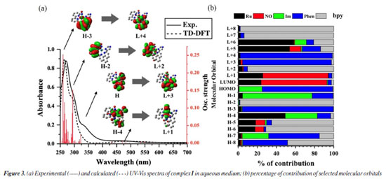 cis-[Ru(bpy)(phen)(SO3)(NO)](PF6) - complex II The complex II (Figure 1b) was prepared by dissolving the cis-Na[Ru(bpy)(phen)(SO3)(NO2)] complex (0.050 g, 0.085 mmol) in methanol (4 mL) under an argon atmosphere. To this mixture, 2.0 mL of concentrated trifluoroacetic acid was added to promote the conversion of NO2- to NO+.17 After 2 h, the solvent was then concentrated in a rotary evaporator to near 8 mL, and the solid was precipitated by the addition of 1.0 g the ammonium hexafluorophosphate (NH4PF6). The brown amorphous solid was collected by filtration, washed with cold water and stored under vacuum. Yield: 65% based on ruthenium(II) for the formula cis-[Ru(bpy)(phen)(SO3)(NO)](PF6). Elemental analysis: C22H18F6N5O5PSRu: calcd.: C 37.15%, H 2.53%, N 9.85%, S 4.51%; found: C 36.02%, H 2.45%, N 9.74%, S 4.34%. Infrared data (KBr pellet, cm-1): νsim (C-H) 3125, 3096, ν(NO+) 1914, ν(C=C) 1608, ν(C=N) 1450, 1434, ν(SO32-) 1120, 991, 626, 594, δ(C-H) 774, 719, ν(PF6-) 843, 558. Equipment Electronic spectra (UV-Vis) were recorded on a photodiode-array spectrophotometer, model 8453 (Agilent). The determination equilibrium acid/base and spectrophotometric titration were carried out using the spectrophotometric method (absorbance measurements were performed at 420 and 405 nm for complex I and II, respectively) at 25.0 ± 0.1 in a 0.1 mol L-1 aqueous solution of HTFA (trifluoroacetic acid). The ionic strength was kept constant at 1.0 mol L-1 through the addition of KCl and the pH was adjusted by adding NaOH, according to similar studies reported for the RuII systems.16 Infrared (IR) spectra (400-4000 cm-1) of the compounds dispersed in KBr were recorded on a Shimadzu FTIR-8400S spectrometer. Electrochemical analysis (cyclic voltammetry and square wave voltammetry) was performed on an Epsilon potentiostat (BASi, Bioanalytical Systems Inc.) using a three-electrode cell. Glassy carbon and a platinum single-wire as used as working and counter electrode, respectively, while an Ag/AgCl (3.5 mol L-1 KCl) electrode was used as reference. The cyclic voltammograms were recorded in 0.1 mol L-1 NaTFA (sodium trifluoroacetate), pH = 3.0. Oxygen was removed by purging the solutions with argon. All measurements were performed at 25.0 ± 0.2 ºC. The 1H, COSY (correlation spectrometry) and HSQC NMR (heteronuclear single quantum coherence nuclear magnetic resonance) spectra were obtained in a Bruker AVANCE DPX 300 spectrometer in CD3SOCD3-d6. Elementary analyses were performed on a PerkinElmer CHN 2400 analyzer. Computational studies Theoretical calculations were performed using the Gaussian 09 program.18 The DFT (density-functional theory) and TD-DFT (time-dependent density-functional theory) methods were used with the B3LYP (Becke, 3-parameter, Lee-Yang-Parr) functional.19-22 In the calculations, the polarizable continuum model was used to simulate the effect of the solvent.21 The LANL2DZ (Los Alamos National Laboratory 2 Double-Zeta) relativistic effective core potential basis set was used for the Ru atom while the 6-31G(d,p) basis set was used for other atoms. The optimized geometries in a potential energy minimum were confirmed by the absence of any imaginary frequency in vibrational analysis calculations.23,24 The energy values and the percentage contributions of the orbitals involved in the electronic transitions were obtained using the Multiwfn and GaussSum 3 software.25 Antibacterial activity Three reference strains from the American Type Culture Collection (ATCC) were used in this study: the Gram-positive bacteria Staphylococcus aureus (ATCC 25923), Staphylococcus epidermidis (ATCC 12228) and the Gram-negative bacteria Pseudomonas aeruginosa (ATCC 9027). The susceptibility of bacteria to complexes I and II was evaluated by determining the MIC of the compounds. The evaluation of the antimicrobial activity started with the pre-inoculum, which was prepared by transferring the strain from the stock onto Agar BHI plates, then leaving it in an oven for 24 h at a temperature of 37 ºC. After this period, the inoculum was prepared by resuspending colonies from the pre-inoculum in saline solution (0.9% saline solution) until reaching turbidity of 0.5 on the McFarland scale, corresponding to 108 CFU mL-1 (colony forming unit per milliliter). Afterwards, 100 μL of the inoculum solution was removed, transferring it to a 9.9 mL saline tube, obtaining a concentration of 106 CFU mL-1. Antimicrobial activity screening was obtained using the broth microdilution method. Initially, 100 µL of Mueller-Hinton (MH) broth was added to a 96-well microplate, and 100 µL of the complex at an initial concentration of 800 μmol L-1 for complex I and 400 μmol L-1 for complex II, followed by serial concentrations, and finally 100 µL of the inoculum suspension. The microplate was incubated for 18 h at 35 ± 2 ºC under agitation (200 rpm) and the optical density evaluation was performed in a microplate bed (Epoch Biotek, Winooski, USA) with a length of 595 nm.