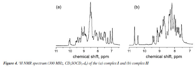 The nitrosyl complexes I and II were further characterized by 1H NMR, 1H-COSY (Figures 4S, 5S and Table 3S, Supplementary Material) and HSQC (Figures 6S, 7S and Table 4S, Supplementary Material) spectroscopy. Figure 4 illustrates the hydrogen nuclear magnetic resonance spectra for complexes I and II. The presence of three signals from the N-heterocyclic ring (6.93, 7.08, and 7.38 ppm) suggests that the imidazole ligand is coordinated to the metal center through the nitrogen atom. Additionally, it was observed signals for the hydrogen atoms of phenanthroline and bipyridine suggesting all hydrogen atoms are not diamagnetically equivalent15,50-52 in agreement with the cis configuration for complexes I and II.