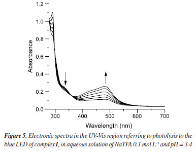 The electrochemical studies of the nitrosyl complexes were performed by using cyclic voltammetry and square wave voltammetry techniques. Figure 8S (Supplementary Material) presents the cyclic voltammogram of I and II complexes in an aqueous medium at pH = 3.0. When a scan in negative potential direction was applied to the working electrode, starting from +0.60 V, only one reversible electrochemical process was observed at 0.219 and -0.102 V for complexes I and II, respectively. This process is characteristic of the {RuNO}6/7 redox couple. On the other hand, when a scan in positive direction, a second electrochemical process is observed at 0.592 and 0.745 V for complexes I and II, respectively. This process is assigned to the RuIII/II redox process of the cis-[Ru(bpy)(phen)(L)(H2O)]n+ complexes, which are generated by NO dissociation from the cis-[Ru(bpy)(phen)(L)(NO+)]n+ compounds. A reasonable interpretation of the electrochemical results is proposed in Reactions 2, 3, and 4. ![]() Aiming to reinforce this assignment, the square wave voltammograms for the nitrosyl complexes were acquired by a change in the time polarization of the working electrode, at -0.10 for complex I and -0.30 V for complex II (Figures 9Sa and 9Sb, respectively, Supplementary Material). For both nitrosyl complexes, it was observed that the peak current related to the RuIII/II redox process increases with an increase in time polarization. A similar behavior is found for other similar complexes of the type cis-[Ru(bpy)2(M)(NO)](PF6)3 in which M are the ligands isonicotinamide, imidazole, sulfite and 4-benzoylpyridine that presented these processes at 0.72, 0.70, 0.62 and 0.73 V, respectively, as reported in the literature.15,16,30,52 Photochemical studies Irradiation with blue LED (light-emitting diode) in complexes I and II was performed to qualitatively determine the release of nitric oxide from the coordinating sphere. Photolysis was accompanied by electronic spectroscopy at different times of exposure to the LED. When analyzing the electronic spectra of the complexes, it is verified that by increasing the exposure time, the intensity of the load transfer transition in the region between 400 and 500 nm increases (Figure 5). Thus, changes in the spectrum suggest that the nitrosyl ligand was released. The irradiation of nitrosyl ruthenium complexes in an aqueous solution with energy photons results in the reduction of nitric oxide and subsequently its release, so that in its place a water molecule is coordinated, forming the aqua complex.16,30,53,54