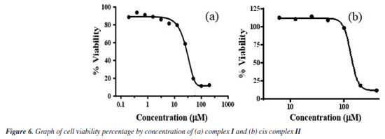 However, against the Gram-negative bacteria Pseudomonas aeruginosa, both complexes I and II demonstrated more selective action, since an MIC corresponding to 57.23 µmol L-1 (55 µg mL-1) and 200.8 µmol L-1 (139 µg mL-1) was presented, respectively, being more active against these strains. In comparison, a series of ruthenium nitrosyl complexes58 tested against Pseudomonas aeruginosa of the fac-[Ru(NO)Cl3(P,P-L)] type, where P,P-L = bis[(2-diphenylphosphino)phenyl]ether and trans-(NO,OMe)-[RuCl(OMe)(NO)(P,P-L)(L)]PF6 where L = pyridine, 4-methylpyridine, 1-methylimidazole and 1H-benzimidazole demonstrated MIC > 500 µg mL-1. This indicates that the compounds under study are promising, considering that Pseudomonas aeruginosa is a Gram-negative bacterium that has an outer membrane with lipopolysaccharides (LPS) and is generally more resistant to antibacterial treatments.59,60 Additionally, reports in the literature8,57,61-63 demonstrate that bipyridine, phenanthroline, imidazole and free coordination sulfite ligands have a higher minimum inhibitory concentration than compounds I and II. Thus, the ability to inhibit the growth of the tested bacteria is due to characteristics presented by the complexes formed, not being attributed separately to each of the ligands. According to the literature,56,64-66 there are some factors that are important regarding the metallic complexes presenting antimicrobial activity, among these are the chelate effect and the total charge of the complexes. Complexes formed by ligands that coordinate to the metallic centers in a bidentate manner, such as 1,10'-phenanthroline, 2,2'-bipyridine and 2,2'-dipyridylamine, present greater antimicrobial efficiency when compared to complexes that have monodentate ligands, such as pyridine. In the case of the total charge of the complexes, it is observed that the antimicrobial activity decreases in the following order: cationic > neutral > anionic.64 In the literature,67 antimicrobial peptides have been studied in which electrostatic interactions have been observed. In bacteria, due to the presence of negatively charged components such as lipoteichoic acid associated with the peptidoglycan wall (Gram-positive bacteria) and lipopolysaccharides associated with the outer membrane (Gram-negative bacteria), an initial electrostatic interaction of the cationic antimicrobial peptides occurs, promoting the adsorption of these molecules and a disturbance in the surface layer of the microorganism. In addition, interactions occur in the deeper layers of the bacterial membrane, either by electrostatic interactions due to the presence of anionic components in the membrane, such as phosphatidylglycerol and cardiolipin, or by hydrophobic interactions due to the phospholipid bilayer present in these unicellular organisms.68,69