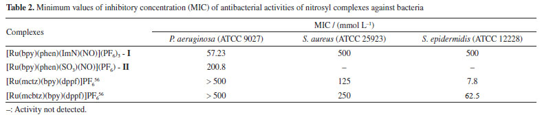 Rose and Mascharak55 have proposed two types of mechanisms for NO release in a photochemical form. The first produces the NO complex and [Ru3+-solvent], while the second gives NO and [Ru2+-solvent] as final products (Equation 5). ![]() It is found that the first mechanism occurs when the nitrosyl ruthenium complexes present ligands such as amine, carboxamide, thiolate, heme and phenolate, while in the second, the complexes have polypyridinic ligands and Schiff base in the second sphere of coordination. In this mechanism, the return of the Ru2+ species, after photolysis, seems to proceed from a spontaneous reduction of the transient species Ru3+. Analyzing complexes I and II, the irradiations presented a profile compatible with the final product of the second mechanism, due to the similarities of the metal, oxidation state, and binders.26,55 Antimicrobial activity The antibacterial activity of the nitrosyl complexes was tested against the Gram-positive bacteria Staphylococus aureus (ATCC 25923), Staphylococcus epidermidis (ATCC 12228) and the Gram-negative bacteria Pseudomonas aeruginosa (ATCC 9027) (Figure 6 and Table 2). The activity of complex I against the Gram-positive strains Staphylococus aureus (ATCC 25923) and Staphylococcus epidermidis (ATCC 12228) was shown to be moderate, since the MIC values of 500 μmol L-1 were higher compared to similar ruthenium systems reported in the literature, which presented MIC values of 125 and 7.8 μmol L-1 for the compound [Ru(mctz)(bpy)(dppf)]PF6 and 250 and 62.5 μmol L-1 for the compound [Ru(mcbtz)(bpy)(dppf)]PF6, respectively.56 In addition to these, other similar ruthenium compounds57 of the cis-[Ru(bpy)(dppz)Cl2] and cis-[Ru(bpy)(dppz)(SO3)(NO)]PF6 type demonstrated greater activity with MIC values of 19.63 and 39.26 μmol L-1, in the order indicated, against the strains Staphylococcus aureus (ATCC 25923) and Staphylococcus epidermidis (ATCC 12228). In turn, complex II showed no antibacterial activity against these Gram-positive strains.