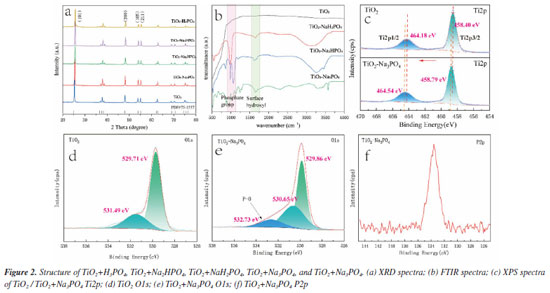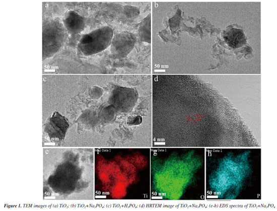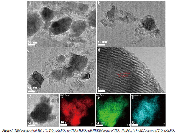 RESULTS AND DISCUSSION Characterization of the samples was performed using transmission electron microscopy (TEM) and high-resolution transmission electron microscopy (HRTEM) to determine their microcrystalline size, microstructure, and elemental composition. The TiO2 samples exhibited larger grain sizes compared to those of TiO2+Na3PO4 and TiO2+H3PO4 (Figures 1a-1c). Studies have shown that phosphate groups can effectively hinder the aggregation and further growth of microcrystals.26 This indicates that TiO2 has been modified by phosphate groups and that these groups can firmly connect to the surface of the microcrystals prepared. Figure 1d shows an HRTEM image of TiO2+Na3PO4, where the microcrystalline size is approximately 35 nm, and the clear d-spacing of 0.35 nm obtained from TiO2+Na3PO4 is consistent with the (101) plane of the anatase-type TiO2.8 The EDS images of TiO2+Na3PO4 indicate that element P is uniformly dispersed on the TiO2 surface (Figures 1e-1h).