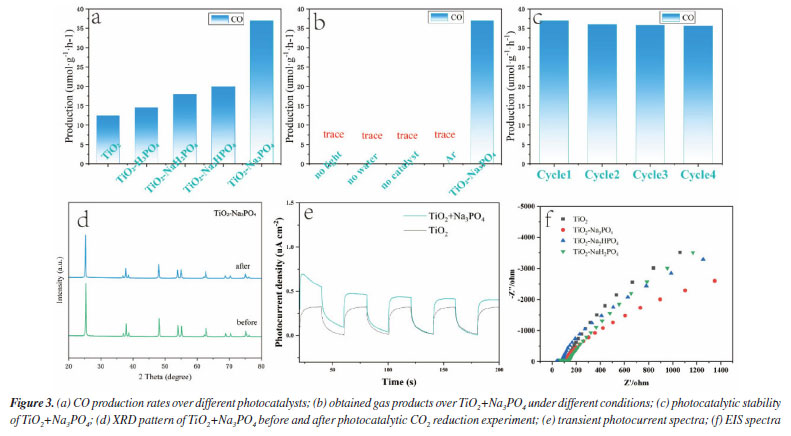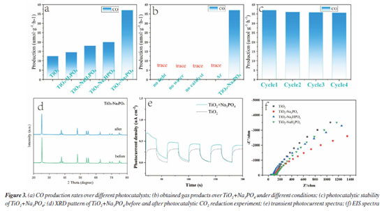 EXPERIMENTAL Reagent and solutions We employed top-tier, analytical-grade reagents without additional purification. Ultrapure water, with a resistivity of over 18 MΩ cm, was the medium for solution preparation. High-purity CO2 (99.99%), hydrogen and argon (with hydrogen accounting for 5%) were sourced from GQ Gas-Unicare. Our primary photocatalyst, titanium dioxide (TiO2, 99.9% pure), was procured from Aladdin Reagent Co., Ltd., China. Phosphoric acid (≥ 85 wt.% in H2O) and sodium phosphate (Na3PO4·12H2O, ≥ 98%), sodium dihydrogen phosphate (NaH2PO4·H2O, ≥ 98%), dibasic sodium phosphate (Na2HPO4·12H2O, ≥ 98%) were obtained from Sinopharm Chemical Reagent Co., Ltd., China. The Nafion solution (5 wt.%) for electrode fabrication was acquired from Sigma-Aldrich. Material fabrication First, commercial TiO2 was calcined at 300 ºC in the air atmosphere for 8 h to remove any possible carbon residues. Another 0.5 g of calcined titanium dioxide was divided into four portions, which were added to. 40 mL of 0.3 M phosphoric acid, sodium dihydrogen phosphate, disodium hydrogen phosphate, and sodium phosphate, respectively. The samples were ultrasonicated for 5 min to make the titanium dioxide disperse more evenly. They were shaken on a shaker for 24 h, then centrifuged and washed with water to remove unstable ions and dried in a vacuum oven at 60 ºC overnight. Finally, the samples were grounded and each one was placed in a crucible that was subsequently wrapped in tin foil. In an environment of hydrogen and argon (with hydrogen accounting for 5%), the samples were calcined at 300 ºC for 2 h. The original sample after calcination is marked as TiO2, and the samples after impregnation and calcination are marked as TiO2+Na3PO4, TiO2+Na2HPO4, TiO2+NaH2PO4, and TiO2+H3PO4. Characterization Powder X-ray diffraction (XRD) analysis was investigated on the Rigaku MiniFlex 600 analyzer using Cu Kα radiation (λ = 1.54056 Å) and with the range of 2θ being from 10º to 70º, the step length being 0.02º, and the scanning speed being 10º min-1. Morphological insights were gleaned through JEM-2100F TEM (20KV) and HRTEM, revealing nanoscale details. UV-Vis diffuse reflectance spectra (DRS) were captured using a Cary4000 spectrophotometer, with BaSO4 as the reflectance standard. Elemental and chemical state analysis was achieved via ESCALAB 250 XPS with Al-Kα radiation, using C 1s (284.8 eV) as a reference. Photoluminescence behavior was probed with a Shimadzu RF-5301PC, unveiling electron transition dynamics. The photocurrent and electrochemical impedance spectroscopy (EIS), measured on a CHI 760 workstation with a 0.1 M Na2SO4 electrolyte, affirmed the electrochemical activity, encapsulating a comprehensive materials characterization. Photocatalytic test A 5.0 mg catalyst is dispersed in 400 μL deionized water and sonicated to form a suspension, then applied to a 3.5 cm slide, air-dried. This slide is placed in a 135 mL chamber, and 100 μL deionized water is added as a hydrogen source. The chamber is sealed with a quartz lid, purged with 99.9% CO2 for 15 min. Finally, the reactor was exposed to simulated sunlight (PLS-SXE300D), with a light intensity of approximately 200 mW cm-2. Gaseous samples were collected hourly and analyzed using gas chromatography (Shimadzu GC-2014A) equipped with a conductivity detector (TCD) and a flame ionization detector (FID). It was used a Hamilton gas - tight syringe (500 μL) to measure the generated gas at 60-min intervals. Additionally, for each time interval, a 500 μL sample from the reactor headspace was collected.