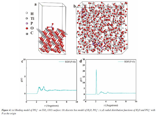 As shown in Figure 3a, we demonstrate that we have modified the phosphate group onto the surface of titanium dioxide. This modification resulted in a carbon monoxide (CO) production rate of 36.93 μmol g-1 h-1, which is approximately 3 times higher than that of the unmodified titanium dioxide, which produced 12 μmol g-1 h-1. The blank control experiment, illustrated in Figure 3b, showed that no CO generated during under conditions lacking H2O, CO2, catalyst, and argon gas flow. This confirms that the CO generated during the Na3PO4+TiO2 photocatalytic reaction originates form CO2. In the stability test presented in Figure 3c, the CO production of Na3PO4+TiO2 remained nearly constant after four performance tests. This indicates that the photocatalytic stability of Na3PO4+TiO2 was well-maintained. Moreover, the XRD patterns of Na3PO4+TiO2, shown in Figure 3d, indicate that there were no change in peak position, half-width, or intensity before and after the photocatalytic reaction. This highlights that crystal phase of Na3PO4+TiO2 remained unchanged, further confirming stability of the Na3PO4+TiO2 photocatalysis. Transient photocurrent is commonly used to analyze the efficiency of charge separation and transport in photocatalysts.33 We analyzed by detecting the difference in the instantaneous photocurrent density during a 20-s interval between turning on and off the light, with a larger difference indicating better charge separation efficiency. As shown in Figure 3e, the transient photocurrent density difference of TiO2+Na3PO4 during the alternation of light and darkness was the maximum, indicating that the modification of TiO2 surface with PO43- was beneficial for the separation of photogenerated electrons and holes. EIS was utilized to investigate the efficiency of charge separation and transport in photocatalysts.34 In the EIS spectrum, the radius of the curve indicates the charge transfer resistance at the interface of the electrode material and electrolyte interface, a smaller radius suggests lower resistance and faster charge transport. As shown in Figure 3f, the radius of the curve for TiO2+Na3PO4 was the smallest. Additionally, there was a noticeable reduction in radius after the modification of TiO2 with other phosphate salts. This indicates that the surface modification of TiO2 with phosphate salts enhances charge transport and separation of photogenerated electrons and holes, thereby decreasing their recombination. Among the tested modifications, TiO2+Na3PO4 exhibited the most significant effect. In addition to using transient photocurrent and EIS to study the charge transport efficiency and separation effect in the photocatalytic process, steady-state fluorescence spectroscopy can also be employed.35 When photogenerated electrons and holes recombine, fluorescence emission occurs. A lower fluorescence intensity indicates reduced recombination of photogenerated electrons and holes, which reflects better separation efficiency. As shown in Figure 5S (Supplementary Material), the fluorescence intensity of the TiO2+Na3PO4 system is lower than that of pure TiO2. This suggests that modifying TiO2 with PO43- enhances the charge transport and improves the efficiency of photogenerated charge separation. The UV-Vis DRS demonstrates that the light absorption capacity of the sample after TiO2 modification remains largely unchanged (Figure 6S, Supplementary Material). The energy band gap (Eg) of the TiO2+Na3PO4 composite, as calculated using the Kubelka-Munk function, is found to be 3.23 eV (Figure 7S, Supplementary Material). The positive slope of the Mott-Schottky curve (Figure 8S, Supplementary Material) indicates that the TiO2+Na3PO4 sample is an n-type semiconductor, with a flat band potential of -0.49 eV relative to Ag/AgCl. According to the provided formula, the flat band potential relative to the normal hydrogen electrode (NHE) is calculated to be -0.293 V. ![]() The XPS valence band spectrum (see Figure 9S, Supplementary Material) further indicates that the energy gap between the valence band (VB) of TiO2+Na3PO4 and the Fermi level is 2.32 eV. Assuming the flat band potential as the Fermi level of the n-type semiconductor, the VB position of Ti2O+Na3PO4 is calculated to be 2.4407 V (relative to RHE). Therefore, the calculated CB edge potential of TiO2+Na3PO4 is -0.7893 V (Figure 10S, Supplementary Material). The catalyst TiO2+Na3PO4 is capable of driving the photocatalytic reduction of CO2 to CO (ECO2/CO = -0.53 V vs. NHE).36 Density functional theory (DFT) calculation To thoroughly investigate the adsorption state of PO43- on TiO2 surfaces, as well as the impact of enhancing the surface microenvironment on water adsorption, we employed density functional theory (DFT) to calculate the binding energy of the PO43- modified TiO2 model system (Figure 4a). Additionally, we utilized Forcite to compute the probability of water molecules appearing around PO43-. The computational results indicated that the binding energy between PO43- and TiO2 was negative, suggesting that PO43- can stably modify the TiO2 surface (Figure 12S, Supplementary Material). Combined with previous XPS data, our findings revealed that the bonding of PO43- with TiO2 resulted in electrons transferring from TiO2 to PO43-, further confirming the charge transfer occurring at the interface between TiO2 and PO43-. Furthermore, PO43- bound to the TiO2 surface could accumulate more electrons, while the TiO2 surface lost electrons. This again demonstrated that modifying the TiO2 surface with PO43- was conducive to charge separation. We utilized the molecular dynamics (MD) simulations to create a discrete box model of PO43- and H2O, optimizing the model to obtain radial distribution functions (RDF). Our primary focus was on the RDF of Total (P-O) (Figure 4c), where the first peak (2-2.2) corresponded to the P-O bond. The second and third peaks (1.2~4.5) represented water molecules. The P-O radial distribution function indicated t