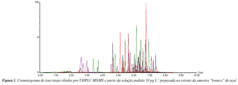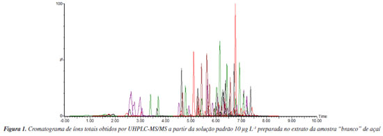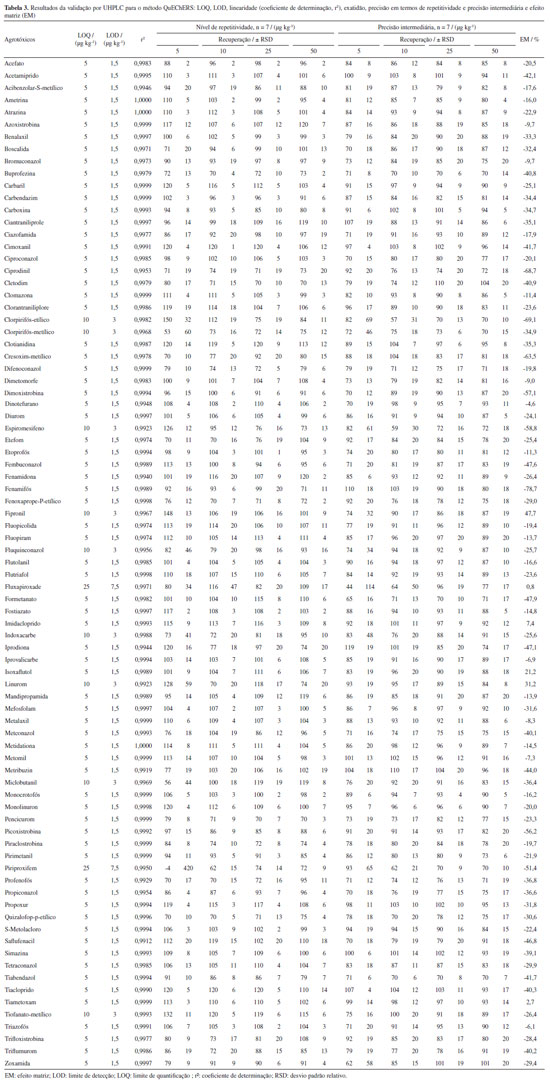 Os resultados obtidos a partir da técnica GC-MS full scan indicam que a associação dos sorventes PSA e C18 promove uma limpeza mais eficiente do extrato de açaí. Para fins comprobatórios, realizou-se o teste gravimétrico, em triplicata, visando verificar quantitativamente a eficiência de diferentes abordagens de limpeza. Notavelmente, foi constatada uma massa ligeiramente maior nas amostras submetidas às etapas de limpezas com PSA e C18 (1,82 mg), em comparação à limpeza feita com uso de propilamino e C18 (1,71 mg). Ademais, os extratos que não foram submetidos a nenhum processo de limpeza apresentaram uma massa de 5,62 mg. Com isso, a limpeza com PSA e C18 apresenta uma porcentagem de cerca de 67,6% de diminuição de massa, enquanto a limpeza com propilamino e C18 apresenta uma diminuição de cerca de 69,6%. A análise comparativa dos resultados revela que a utilização do sorvente propilamino resultou em uma limpeza mais efetiva, notavelmente evidenciada pelos menores valores de interferentes mostrados no teste de gravimetria. Este resultado sugere que a escolha do sorvente propilamino contribui para a obtenção de extratos mais limpos e, portanto, mais adequados para a subsequente determinação de resíduos de agrotóxicos em polpa de açaí. Porém, ao verificar os resultados de recuperação dos 83 agrotóxicos, associados ao C18, percebe-se que o propilamino apresentou o menor número (73) de compostos com recuperação satisfatória. O PSA apresentou recuperação satisfatória para 75 agrotóxicos. Ao se comparar com os demais trabalhos que também utilizaram QuEChERS como preparo de amostra,11,12 pode-se perceber que o uso do PSA é utilizado em ambos, tendo, ainda a presença do C18 em um deles, o que indica que tais sorventes são adequadamente utilizados para este tipo de matriz para a determinação por UHPLC-MS/MS. Validação de método A validação do método analítico para os agrotóxicos listados na Tabela 3 foi realizada em conformidade com as diretrizes estabelecidas pelos guias INMETRO20 e SANTE.16 As soluções analíticas utilizadas neste estudo foram preparadas tanto em solvente (acetonitrila) quanto no extrato obtido a partir das amostras branco de polpa de açaí. O método validado envolve a pesagem de 10 g da amostra de polpa de açaí, à qual são adicionados 10 mL de acetonitrila, seguidos de agitação em vórtex por 1 min. Em seguida, os sais de extração QuEChERS original (4 g de MgSO4 e 1 g de NaCl) são adicionados, e a mistura é novamente agitada em vórtex por 1 min e submetida a centrifugação (8 min, 3400 rpm a 20 ºC). Na etapa de limpeza do extrato, 1 mL do sobrenadante é adicionado ao sorventes (300 mg MgSO4, 50 mg de PSA e 250 mg de C18). Após agitação por 1 min em vortex e centrifugação (8 min, 3500 rpm a 20 ºC), o sobrenadante (extrato de açaí) é diluído 5 vezes em água ultrapura e em seguida é filtrado através de filtros de nylon de 13 mm com porosidade de 0,2 µm, e então analisado por UHPLC-MS/MS. Dessa maneira, foram avaliados os parâmetros de validação do método analítico para os 83 agrotóxicos em estudo, com base nos seguintes critérios: seletividade, linearidade, efeito matriz, limite de detecção (LOD), limite de quantificação (LOQ), exatidão e precisão (repetibilidade e precisão intermediária). O método proposto demonstrou uma seletividade adequada, conforme evidenciado pela análise comparativa dos cromatogramas do extrato da amostra branco de açaí, do branco dos reagentes e do extrato da amostra branco de açaí fortificado com uma solução de 10 µg L-1. Nessas análises, não foram detectados interferentes no mesmo tempo de retenção dos agrotóxicos selecionados, confirmando assim a seletividade do método. A linearidade do procedimento analítico foi verificada por meio da avaliação do coeficiente de determinação (r²), que foi obtido a partir de curvas analíticas preparadas no extrato do açaí. Inicialmente, a curva analítica foi elaborada em acetonitrila e, subsequentemente, no extrato de açaí. As concentrações dos pontos da curva que foram avaliadas incluíram os seguintes níveis de concentração: 0,5; 1; 2; 5; 10 e 20 µg L-1. Tal intervalo escolhido para análise permitiu que 83 compostos avaliados apresentasse um coeficiente de determinação (r2) superior a 0,990, conforme demonstrado na Tabela 3. Além disso, a faixa de trabalho estabelecida para o método foi de 0,5 a 20 µg L-1, garantindo a precisão e a exatidão das quantificações realizadas nesse intervalo de concentrações. O efeito matriz (EM) foi avaliado pela comparação dos coeficientes angulares das curvas analíticas preparadas tanto na acetonitrila quanto no extrato do branco de açaí, utilizando a Equação 1. A faixa de concentração avaliada variou de 0,5 a 20 µg L-1. Como muitos agrotóxicos apresentaram efeito matriz superior a ±20%, o efeito matriz foi compensado por meio de uma curva no extrato branco da matriz. O limite de quantificação (LOQ) do método foi determinado a partir dos ensaios de fortificação. Este limite foi considerado como o menor nível de fortificação (µg kg-1) que apresentou uma razão sinal/ruído superior a 10, onde a precisão e a exatidão dos compostos de interesse estavam dentro dos níveis aceitáveis de recuperação e desvio padrão relativo (70 a 120%; RSD ≤ 20%) conforme as diretrizes preconizadas pela SANTE.16 Já o valor do limite de detecção (LOD) do método foi calculado a partir do LOQ, dividindo este valor por 3,33. Conforme a Tabela 3, os valores de LOQ do método variaram entre 5 e 25 µg kg-1, enquanto os valores de LOD ficaram entre 1,5 e 7,5 µg kg-1, valores estes considerados satisfatórios para o método desenvolvido para determinação de resíduos de agrotóxicos em alimentos. Ao comparar com o método desenvolvido por Froés et al.13 empregando a técnica MSPD,13 que apresentou LOQ entre 50 e 100 µg kg-1 e LOD ent