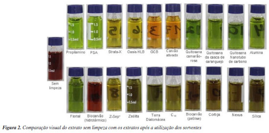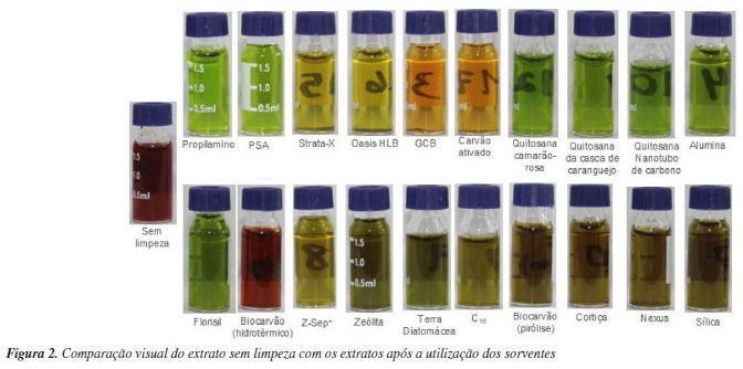 O método QuEChERS citrato revelou uma menor capacidade de recuperar os agrotóxicos quando comparado às outras variações, concluindo-se que o QuEChERS citrato não seria a escolha mais adequada para as necessidades analíticas do estudo em questão. Entre as versões QuEChERS original e acetato, no método original não é necessária a utilização de ácido acético e do sal acetato de sódio, o que segue os princípios da Química Verde que preconiza que a utilização de substâncias auxiliares (solventes, agentes de separação etc.) deve ser evitado sempre que possível.21 Comparando-se com estudos anteriores, pode-se perceber que o método QuEChERS original já foi utilizado para determinação multirresíduo em polpa de açaí para 174 agrotóxicos11 e o QuEChERS citrato já foi validado para a mesma matriz, porém, para um método com apenas 14 agrotóxicos, sendo este utilizado por conta das características físico-químicas específicas de alguns analitos desejados para estudo.12 Considerando tais fatores, bem como a perspectiva da Química Verde, que promove práticas sustentáveis e de menor impacto ambiental, a escolha do método QuEChERS original emergiu como uma decisão estratégica, embasada tanto nos resultados obtidos quanto nas considerações econômicas e ecológicas associadas aos reagentes empregados. Avaliação dos sorventes utilizados na etapa de limpeza do extrato A polpa de açaí é caracterizada como uma matriz complexa devido à variabilidade dos componentes presentes em suas matérias-primas. Os principais nutrientes encontrados neste alimento incluem carboidratos, lipídios, proteínas, vitaminas e minerais. Dentre estes, os macronutrientes proteicos e lipídicos são os mais relevantes no que diz respeito à interferência na etapa de preparo de amostras. Portanto, foi avaliada a etapa de limpeza mais adequada com o objetivo de remover esses interferentes, sem eliminar os compostos de interesse. Optou-se por realizar testes com 20 diferentes materiais para avaliar a remoção dos coextrativos presentes na matriz, sem comprometer a recuperação dos compostos. A Figura 2 apresenta os extratos obtidos após a realização de cada um dos 20 testes de limpeza, em ordem decrescente de remoção do coextrativo.