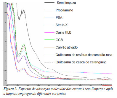 Com base nesses resultados, foram escolhidos os oito extratos que demonstraram maior eficácia na etapa de limpeza, de forma visual: propilamino, PSA, Strata-X, Oasis HLB, GCB, carvão ativado, quitosana de camarão-rosa e quitosana de casca de caranguejo. Tais extratos foram posteriormente analisados por espectrofotometria de absorção molecular UV-Vis, entre 200 e 800 nm, a partir da qual foram obtidos os espectros de absorção apresentados na Figura 3. Pela análise dos espectros UV-Vis dos extratos é possível observar a predominância de compostos que exibem absorção na região do ultravioleta. Provavelmente os compostos presentes nos extratos pertencem a mesma classe de moléculas, tendo bandas no UV (entre 217 e 309 nm) muito semelhantes às dos espectros de compostos fenólicos e de seus derivados, que são compostos que ocorrem em açaí.22 Examinando os espectros, é possível constatar que os sorventes PSA e o propilamino foram os sorventes que proporcionaram a maior eficácia na limpeza de interferentes. Isso se evidenciou pela redução da intensidade do sinal observada em todos os picos, ao se fazer a comparação dos sinais obtidos dos outros extratos com a adição dos diferentes sorventes com o sinal obtido do extrato sem processo de limpeza.