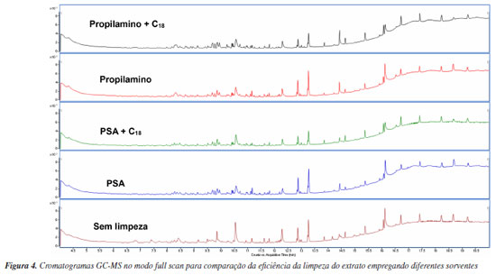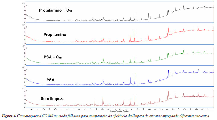 Com isso, os extratos nos quais foi realizada a etapa de limpeza com estes dois sorventes foram selecionados para a realização das análises por GC-MS full scan, comparando seu uso puro com a associação de 250 mg de C18, sendo este acrescentado na limpeza devido sua eficiência em amostras que contenham grande quantidade de lipídios.10,15 A Figura 4 apresenta os resultados dessa análise.