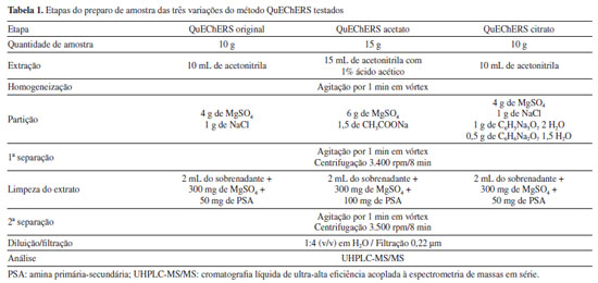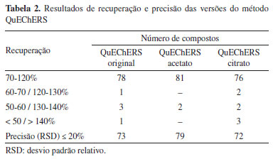 Avaliação da etapa de extração A Tabela 2 apresenta os resultados dos testes com as diferentes versões do método QuEChERS. A avaliação foi feita em triplicata fortificando a matriz branco com 83 agrotóxicos na concentração de 50 μg kg-1. Ao comparar as três versões do método QuEChERS foram observados resultados de recuperação e de precisão (RSD) consistentes e similares. Os testes apresentaram resultados satisfatórios, com recuperação entre 70 e 120% e RSD ≤ 20%, para 78 compostos com o QuEChERS original, 76 compostos com a versão citrato e 81 compostos com o acetato. Supõe-se que alguns compostos não foram recuperados por apresentarem menor caráter ácido, devido ao uso de acetonitrila como solvente de extração no QuEChERS acetato.