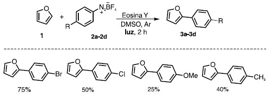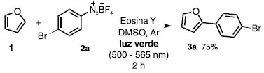 ![]() Esquema 1. Reação teste de arilação do furano mediada por eosina Y