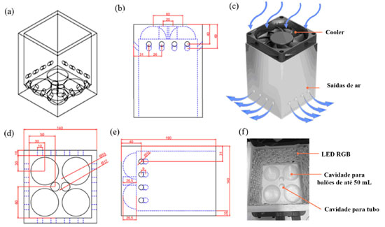 ![]() Figura 2. Diagrama esquemático das dimensões exatas e dos principais componentes do fotoreator: (a) vista isométrica das paredes do fotoreator; (b) dimensões das cavidades internas mostradas em milímetros; (c) sistema de resfriamento por circulação de ar; (d) dimensões das paredes mostradas em milímetros; (e) dimensões de altura, largura e profundidade mostradas em milímetros; (f) visão interna do fotoreator pronto