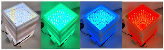 Montagem do fotoreator Foram empregados 5 m de fitas de LED (5050 RGB, 300 LEDs) com comprimentos de onda variáveis e controlados remotamente. As fitas foram coladas nas paredes do fotoreator, com uma distância de 0,5 mm, e ligadas a um fio de cobre com uma tomada (Figura 3). As fitas de LED apresentam uma potência de 14,4 W m-1, são bivolts automáticas, com vida útil de 50.000 h e temperatura de trabalho variando de -20 a 50 °C. Estão disponíveis as cores branco, verde, vermelho e azul (Figura 4). No controle remoto possui 16 variações destas cores, do mais forte ao mais claro.