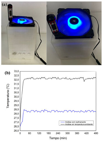 ![]() Figura 5. (a) Controle da temperatura interna do fotoreator; (b) gráfico temperatura × tempo