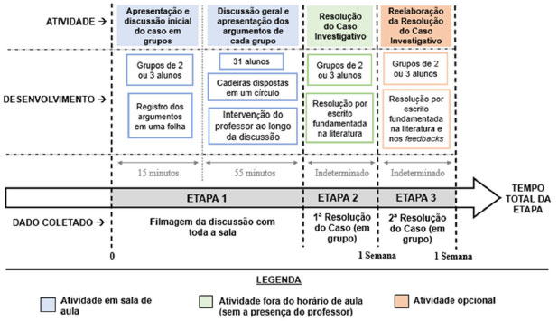 ![]() Figura 4. Distribuição dos argumentos dos estudantes e intervenções do professor formador ao longo do tempo da discussão do caso investigativo
