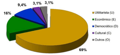 Durante a fase de pré-análise do material, percebeu-se que os argumentos sintetizados por Millar,16 que constituíram as categorias a priori, não seriam suficientes para contemplar todos os argumentos apresentados pelos licenciandos. Em função disso, recorreu-se à utilização de uma categoria a posteriori, denominada "outros". Esta categoria abarca um argumento relacionado à ideia de empatia entre alunos, ou seja, um argumento segundo o qual o fato de um aluno não se interessar pela disciplina de Química não significaria que os outros estudantes deveriam ser privados de adquirir esses conhecimentos. Esse argumento não se alinha, por exemplo, à categoria utilitarista e nem à econômica. A Figura 3 apresenta o gráfico com a ocorrência em porcentagens dos argumentos utilizados pelos discentes.