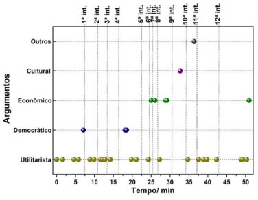 Como apontado por Millar,16 poucas ou quase nenhuma decisão prática do cotidiano realmente necessita ser informada obrigatoriamente de conhecimentos científicos. Sendo assim, o argumento utilitarista pode ser facilmente refutado e, portanto, por si só não é considerado forte o suficiente para que os futuros professores sustentem a importância da disciplina de Química no currículo escolar. Desse modo, tal argumento precisaria ser devidamente problematizado a fim de avançar as discussões em direção ao desenvolvimento de argumentos mais sofisticados alinhados a outros valores da educação científica de estudantes do nível médio. Nesse sentido, as intervenções realizadas pelo professor formador durante a discussão dos alunos foram imprescindíveis para a problematização e o aparecimento de outros tipos de argumentos. A Figura 4 apresenta os argumentos utilizados pelos discentes em relação aos momentos de mediação. As categorias de argumentos (eixo y) estão distribuídas em uma linha do tempo (eixo x) e as linhas tracejadas verticais sinalizam momentos de intervenção realizadas pelo professor formador. Cada ponto marcado no gráfico representa a aparição de determinada categoria de argumento na fala dos alunos ao longo do debate.