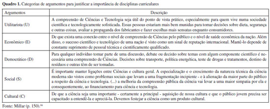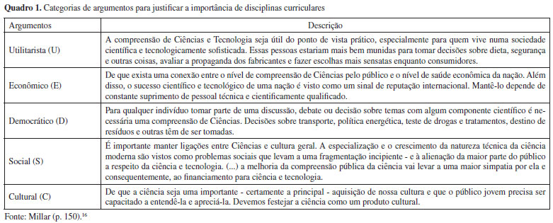 FUNDAMENTAÇÃO TEÓRICA No sentido de amparar as análises deste trabalho, apresentam-se a seguir as informações relativas à importância do ensino de Ciências para alunos da educação básica e a proposição de uma ação formativa capaz de aprofundar conhecimentos de licenciandos acerca da importância da componente curricular Química na educação escolar. Prerrogativas para sustentar a importância do ensino de Ciências no currículo do Ensino Médio Pode-se assumir como premissa que uma das consequências da reforma do Ensino Médio foi a desvalorização do ensino de Química. Desse modo, é importante apresentar, à luz de um quadro teórico, as principais características que justificam a inserção de determinado conhecimento no currículo escolar. Milner15 argumenta que uma área do conhecimento deve apresentar três critérios fundamentais para fazer parte de um currículo escolar, quais sejam, contribuir, de forma privativa, para aquisição de habilidades, conceitos e perspectivas específicas; ser adquirida somente sob instrução no ensino formal; e possuir importância e valor para os indivíduos. Além de apresentarem conteúdos e abordagens próprias, que não se encontram em outras áreas do conhecimento, muitas vezes, os conhecimentos químicos divergem dos conhecimentos de senso comum. Em função disso, não podem ser adquiridos espontaneamente com as experiências de vida em sociedade. Outrossim, a literatura especializada busca discutir e sistematizar os diferentes argumentos utilizados para justificar sua importância e seu valor para os indivíduos. Nessa perspectiva, e a partir de uma revisão na literatura, o pesquisador inglês Robin Millar16 reconheceu a existência de tais argumentos e os expôs em cinco categorias, que estão apresentadas no Quadro 1.