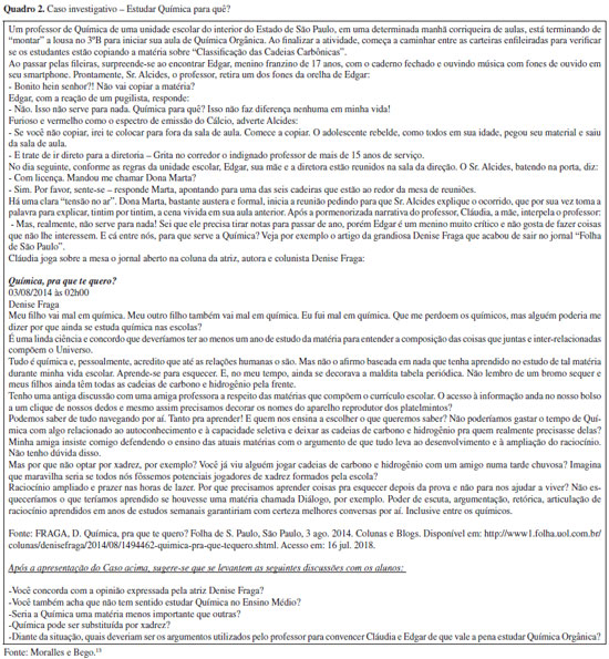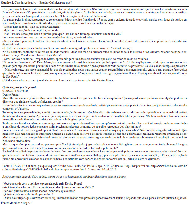 Para o pesquisador, os argumentos apresentam diferentes perspectivas que justificam a inserção das Ciências da Natureza no currículo escolar. No entanto, eles não são irrefutáveis e apresentam certas fragilidades, notando-se que alguns argumentos apresentam maiores fragilidades do que outros. Assim, na visão de Millar,16 o argumento utilitarista poderia ser questionado a partir da premissa de que quase nenhuma decisão prática cotidiana é tomada com base em conhecimento científico e, quando presente em discursos, apresenta-se na forma de regras gerais de senso comum e sem alguma precisão científica. Destarte, por si só, não justificaria um ensino de Ciências obrigatório para todos. O pesquisador inglês prossegue diante de suas análises e estipula que, para o argumento econômico, ocorre ênfase na necessidade de uma instrução dedicada a atender demandas das indústrias relativas à geração de mão de obra qualificada. Quanto ao argumento democrático, a avaliação do autor sugere uma fragilidade direcionada para a própria complexidade do conhecimento científico. Isto é, os debates que ocorrem na sociedade existem em diferentes níveis e estão sempre evoluindo com o tempo e, assim sendo, não é possível afirmar que, com apenas o conhecimento científico adquirido na escola, o indivíduo será capaz de debater sobre questões que possam, eventualmente, surgir no seu convívio em sociedade. Para finalizar, os argumentos social e cultural estão intimamente atrelados e se constituem como fortes argumentos para justificar a necessidade do ensino de Ciências, pois "Ciências não é só a principal aquisição cultural, é o produto definidor de nossa cultura, aquilo que podemos esperar mais confiantemente que será identificado pelos historiadores e arqueólogos do futuro como característico de nossos tempos." (p. 81)16 Em razão dessas considerações, a perspectiva da intervenção didático-pedagógica apresentada nesta pesquisa foi a de que os estudantes pudessem desenvolver uma argumentação plural, reconhecendo eventuais fragilidades de cada argumento empregado nas respostas aos questionamentos realizados. Isto posto, a ideia de pluralidade requer um rol de argumentos para amparar a importância da disciplina Química em currículos escolares, de forma que um único argumento não deve ser considerado mais correto que outro. Assim, a argumentação plural ajudaria a suprir fragilidades de alguns argumentos, como o utilitarista, principalmente quando agregados a argumentos mais robustos, como o social e o cultural. O uso de casos investigativos no ensino de Química Os casos investigativos (CI), também denominados como estudos de casos, compreendem narrativas que descrevem situações-problema, reais ou simuladas, de caráter científico e/ou sociocientífico. Nessa proposta, é solicitado que os estudantes busquem soluções para dilemas propostos com base em fundamentos científicos. Os resultados advindos do uso dessa estratégia de ensino permitem aproximar os estudantes de seu futuro profissional e possibilitar a integração entre diferentes conhecimentos.17,18 Nessa perspectiva, pesquisas têm apontado que o próprio processo de elaboração de CI pode ser muito enriquecedor para a formação inicial e continuada de professores de Química, pois permitem atualização científica e pedagógica, fomentos à autoestima e às habilidades de leitura e escrita acadêmico-científica.19-21 Anastasiou e Alves22 destacam uma sequência de operações de pensamento durante a resolução do CI: a análise; a interpretação; a crítica; o levantamento de hipóteses; a busca de suposições; a decisão; e, finalmente, a síntese. Além disso, as autoras discutem que os CI podem ser avaliados a partir da aplicação dos conhecimentos; da coerência das resoluções; em razão da riqueza e profundidade da argumentação; e da síntese apresentada pelos alunos. Vale sublinhar que os CI são potenciais para viabilizar práticas de avaliação processual e formativa, uma vez que a observação e o acompanhamento do desempenho dos alunos durante a análise e a resolução de um caso permitem ao professor identificar dificuldades específicas de aprendizagem e fornecer feedback ajustado para atender às necessidades individuais e/ou coletivas.17-21,23 Tendo em vista as características e potencialidades do uso de CI, utilizou-se o CI elaborado por Moralles e Bego,13 intitulado "Estudar Química para quê?" (Quadro 2), a fim de fomentar a discussão, em um contexto acadêmico direcionado à formação profissional docente, acerca da importância da inserção da disciplina de Química no currículo oficial do Ensino Médio.