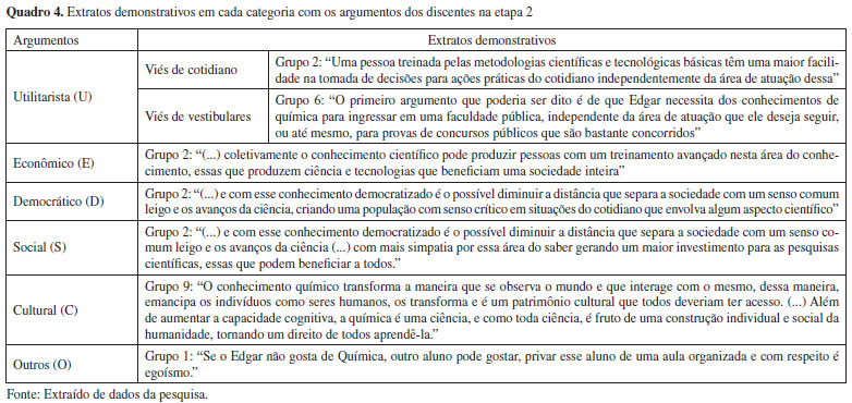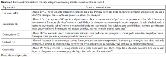 Como é possível observar, o argumento utilitarista foi o mais utilizado pelos estudantes durante o debate, representando 69% (22 ocorrências). Além disso, o argumento cultural apresentou baixa ocorrência (3,1% - 1 ocorrência) e o argumento social não foi mencionado em nenhum momento do debate. Por sua vez, o Quadro 3 apresenta extratos demonstrativos das categorias presentes nas falas dos estudantes, ilustrando os resultados do processo de categorização segundo a AC.