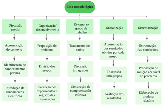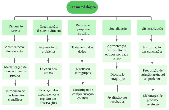 METODOLOGIA Local e participantes A pesquisa sistematizada neste artigo foi realizada com seis alunos matriculados na disciplina de Pesquisa e Prática Pedagógica no Ensino de Química II (Orgânica), do curso de Licenciatura em Química da Universidade Federal do Espírito Santo (UFES). A intervenção pedagógica ocorreu ao longo do semestre letivo de 2023/2. A sequência de ações foi organizada em seis encontros, todos presenciais, totalizando 22 horas. O trabalho foi submetido para avaliação ao Comitê de Ética em Pesquisa da Universidade Federal do Espírito Santo (CEP/UFES, campus Goiabeiras), sendo posteriormente aprovado (CAAE: 75710323.4.0000.5542). Planejamento e execução da estratégia de ensino A estratégia didático-experimental escolhida, a AEP, prevê como etapa de planejamento o delineamento do eixo teórico, que compreende a proposição do problema, objetivo experimental e diretrizes metodológicas. O problema proposto para os estudantes foi: "Como os conhecimentos da Química podem contribuir para o reaproveitamento das sementes do mamão?". Atrelado ao problema, foram traçados dois objetivos experimentais: