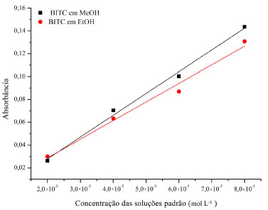 ![]() Figura 3. Curvas de calibração construídas a partir de soluções padrão de BITC em metanol (MeOH) e etanol (EtOH)