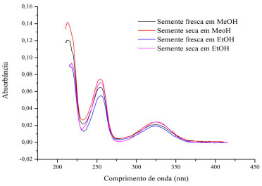 ![]() Figura 4. Espectros de UV-Vis obtidos para os diferentes extratos das sementes de mamão