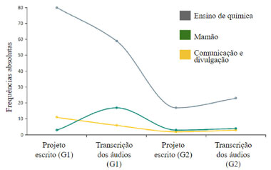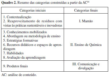 A partir da análise do relatório também foi possível identificar segmentos de textos nos quais os alunos discutem indiretamente as perspectivas de solução para o problema proposto, conforme disposto no Quadro 4S (Material Suplementar). Nas discussões apresentadas por ambos os grupos foi possível identificar os dois eixos de conhecimentos da Química em condições de contribuir para o reaproveitamento de sementes do mamão, apontando o atendimento dos objetivos experimentais traçados no planejamento da AEP. Análise de conteúdo do projeto de ensino Os projetos elaborados pelos grupos 1 e 2 abarcaram conceitos e princípios da Química envolvidos na temática reaproveitamento de resíduos do mamão, possíveis de serem trabalhados no ensino médio. O Quadro 5S (Material Suplementar) apresenta um resumo dos projetos, configurado em tamanho padrão, elaborado a partir da ferramenta AI Assist do software MAXQDA.26 A partir da codificação dos materiais (projetos redigidos e transcrição dos áudios das apresentações) por elementos temáticos comuns emergentes, com enumeração de suas frequências de aparição nos textos (f = x%), foram constituídas nove categorias iniciais. Na etapa de categorização, os segmentos de textos pertencentes a cada categoria inicial foram reavaliados, agrupando-se em 3 categorias finais. O Quadro 2 apresenta as categorias iniciais e as finais.