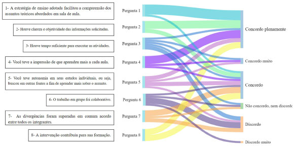 Linhas mais espessas com grau de concordância positivo foram obtidas para as afirmações 1, 2, 4 e 8, as quais se referem a estratégia de ensino como facilitadora da aprendizagem, clareza e objetividade nas informações, aprendizagem progressiva e contribuição efetiva da intervenção para a formação dos indivíduos em questão. Por outro lado, as afirmações 3, 6 e 7 apresentaram acentuado grau de discordância. Dizem respeito ao tempo fornecido para execução das atividades, trabalho em grupo e superação de divergências com os demais participantes. A afirmação 5 apresentou taxas iguais de concordância e discordância, se referindo ao aprofundamento das temáticas trabalhadas por meio de estudos individualizados. De modo geral, as respostas apontam para contribuições significativas da intervenção pedagógica em conjunto com a estratégia de ensino utilizada, com ressalva do tempo disponibilizado para execução das atividades. Em síntese, o emprego da AEP propiciou um ambiente de ensino favorável ao desenvolvimento de uma aprendizagem com significado, contextualizada e aprofundada, ao permitir que os estudantes conectassem conceitos teóricos a experiências práticas, refletissem criticamente sobre suas decisões e aplicassem o conhecimento em um contexto mais amplo e sustentável.