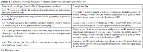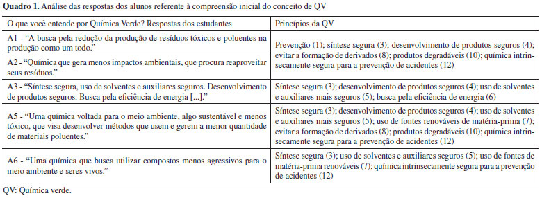 RESULTADOS E DISCUSSÃO Conhecimentos prévios Por meio da ficha experimental foi possível identificar as concepções prévias dos estudantes acerca de aspectos da QV. Quando questionados sobre princípios da QV,20 apenas um dos estudantes afirmou ter tido contato com eles durante sua formação em Química (A3), os demais responderam "não" e "não me recordo". Quando solicitados que citassem tais princípios, apenas dois apresentaram resposta. Os demais reafirmaram que "nunca haviam ouvido falar" ou que "não conheciam". Apesar da maioria dos alunos terem afirmado não ter conhecimento dos princípios, ao serem questionados sobre o que entendem por QV, forneceram respostas que se enquadram nas definições de alguns princípios, conforme análise apresentada no Quadro 1.