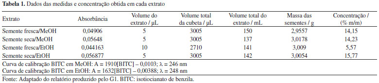Na comparação dos resultados, ambos os grupos reconheceram que a extração realizada a partir de sementes secas em etanol produziu um extrato com teor significativo de BITC, tornando o emprego desse solvente viável nesse tipo de amostra (e de técnica). Sendo assim, guardadas as particularidades desta pesquisa, o uso do metanol poderia ser substituído pelo etanol, mantendo-se a eficiência da extração. O G1 ressaltou que o etanol é um solvente viável para ser empregado na extração do BITC, pois mantém a coerência entre a proposta de reaproveitamento de resíduos e o procedimento adotado na extração dos compostos bioativos presentes nesses resíduos, agora ambos enquadrados nos princípios da QV, conforme trecho a seguir: