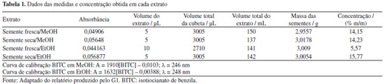 A partir da análise apresentada no Quadro 1, foi possível identificar que os estudantes atrelaram a QV à preocupação com a redução do impacto ambiental e a promoção da segurança e sustentabilidade na prática química. Apesar da maioria deles ter apresentado dificuldade para citar princípios da QV, as respostas apresentadas para o conceito de QV demonstram uma compreensão parcial de seus princípios e objetivos. A resposta do A5, por exemplo, expõe implicitamente 7 princípios da QV. Sistematização dos conhecimentos e resultados experimentais Inicialmente foi apresentado aos estudantes o procedimento utilizado previamente para extração do BITC, bem como o conceito de QV e definição de seus princípios. O intuito era propiciar a reflexão dos estudantes sobre o procedimento adotado e avaliar se este correspondia-se aos princípios da QV, estando em consonância com a prática de reaproveitamento de resíduos. Ao serem questionados acerca dos princípios da QV abarcados pelo procedimento de extração do BITC, o estudante A2 citou a "Busca por eficiência de energia (6)", considerando que a extração é realizada em temperatura ambiente. Quatro dos cinco alunos respondentes do questionário atrelaram o procedimento ao princípio "Uso de fontes de matérias-primas renováveis (7)", devido ao emprego das sementes do mamão. Quando questionados sobre "Qual(is) princípio(s) da Química Verde poderia(m) ser utilizado(s) para repensar o procedimento adotado na extração do BITC?", quatro estudantes citaram o princípio "Uso de solventes e auxiliares seguros (5)", propondo a modificação dos solventes empregados inicialmente (metanol e diclorometano) devido ao seu grau de toxicidade. Partindo desta discussão prévia, foi solicitado que os estudantes realizassem pesquisas na literatura a fim de propor a substituição do solvente empregado, com vistas ao uso de substâncias menos tóxicas. Para uma proposição eficiente, deveriam ser considerados aspectos discutidos previamente, como a natureza do composto a ser extraído e a do solvente, visando a manutenção da eficiência da extração, além do custo e compatibilidade do processo. Após discussões em conjunto e a realização de pesquisas bibliográficas, dois solventes foram sugeridos: o etanol absoluto e o acetato de etila. Por questões de custo e disponibilidade, o etanol foi priorizado. Desta forma, foi proposta a extração com emprego de dois solventes distintos para fins de comparação da eficiência: o metanol e o etanol. O objetivo era a avaliação da toxicidade dos solventes e a viabilidade de seu uso, considerando fatores para garantir a eficácia, segurança e sustentabilidade do processo. Como já mencionado, cada grupo trabalhou com um tipo de amostra, mas ambos realizaram a extração com dois solventes. Apesar do procedimento da extração ter sido fornecido aos estudantes a fim de orientar as ações a serem desenvolvidas experimentalmente, houve flexibilidade e adaptação quando os alunos realizaram a escolha de um segundo solvente, menos tóxico, e decidiram que no tratamento das amostras frescas não haveria remoção da sarcotesta. Para determinação do teor de BITC nos extratos obtidos, foram construídas curvas de calibração para os dois solventes utilizados. Conforme o segmento de texto extraído do relatório, o G2 relatou a seleção das concentrações das soluções utilizadas na construção da curva, e observou a relação direta entre as medidas de absorbância e concentração das soluções, estabelecidas pela lei de Lambert-Beer: