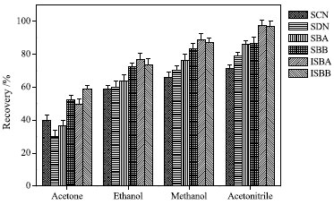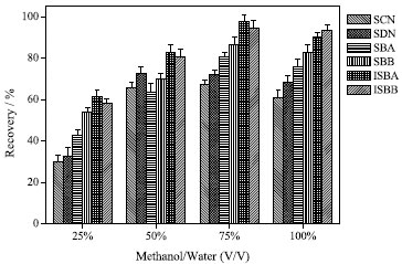 RESULTS AND DISCUSSION Effect of extraction solvent and its volume The selection of extraction solvent is very important for extraction efficiency. Methanol and acetonitrile are the most commonly used as extraction solvents for target compounds from plant-derived sample.32 In this study, effect of three solvents including methanol and acetonitrile were evaluated for extraction efficiency, and the results showed that the average recoveries were higher for methanol as extraction solvent. Therefore, methanol was selected as the extraction solvent. SCN, SDN, SBA, SBB, ISBA, ISBB are flavonoids with high polarity. Therefore, methanol aqueous solution was investigated as extraction solvent to analyze the compounds, and the results are shown in Figure 1. Consequently, 75% methanol was selected as extraction solvent for the subsequent studies.