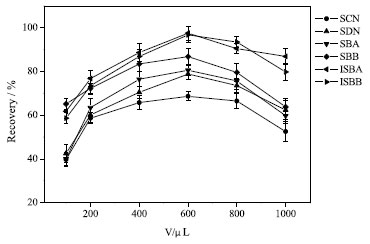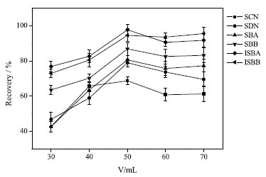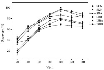 Optimization of ILs-DLLME conditions In order to obtain the optimal conditions of ILs-DDLME, a series of parameters affecting the extraction efficiency were studied, including extraction solvent, dispersive solvent, extraction time, pH value and ionic strength. The recovery was used as an indicator and 0.5 g samples (each analyte with 100 ng g-1 added to each sample) were used to optimize the extraction conditions. All experiments were made in triplicate, and the blank control sample was 0.5 g sample without any target compound. Effect of extraction solvent and its volume Appropriate extractant is the key to improve the analytical sensitivity. The effects of [OMIM]PF6 and [HMIM]OTF on the extraction efficiency of SCN, SDN, SBA, SBB, ISBA, ISBB were investigated. The results showed that [OMIM]PF6 had better extraction efficiency for SCN, SDN, SBA, SBB, ISBA, ISBB with less interference. Therefore, [OMIM]PF6 was selected as the extractant in this paper. The recoveries increased with the increase of volume of [OMIM]PF6. 20, 40, 60, 80, 100, 120 and 140 µL were investigated. When 100 µL of [OMIM]PF6 was added, the extraction recovery reached its maximum and stabilized, as shown in Figure 3. This is because the ILs-DLLME process reached equilibrium with 100 µL of [OMIM]PF6 as the extraction agent. Therefore, 100 µL [OMIM]PF6 was used as the optimal extraction solvent volume in subsequent experiments.